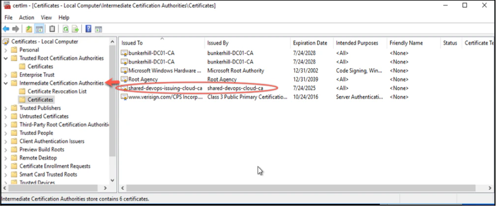 Go to the “Intermediate Root Certification Authorities” and then “Certificates”, you will see the issuing certificates certificate.