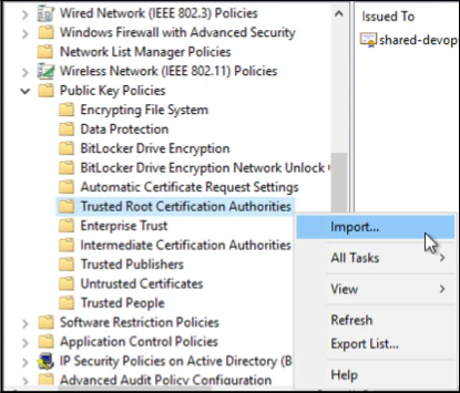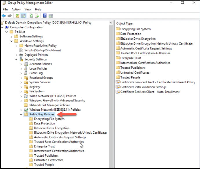 Go to “Computer Configuration” > “Windows Settings” > “Security Settings” > “Public Key Policy”.