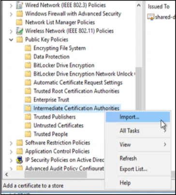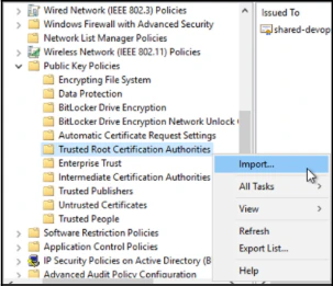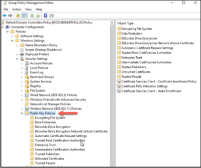 Go to “Computer Configuration” > “Windows Setting” > “Security Settings” > “Public Key Policy”