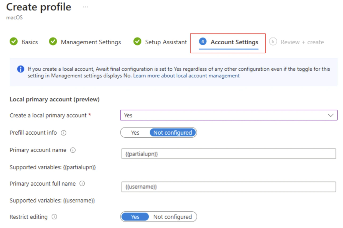 - Optionally, on the Account Settings page, you can configure the local primary account on targeted Macs