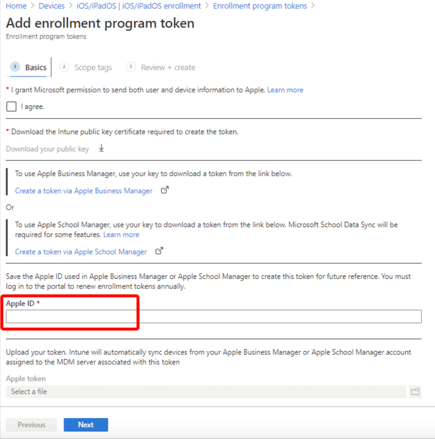 - Select I agree to grant permission to Microsoft to send user and device information to Apple