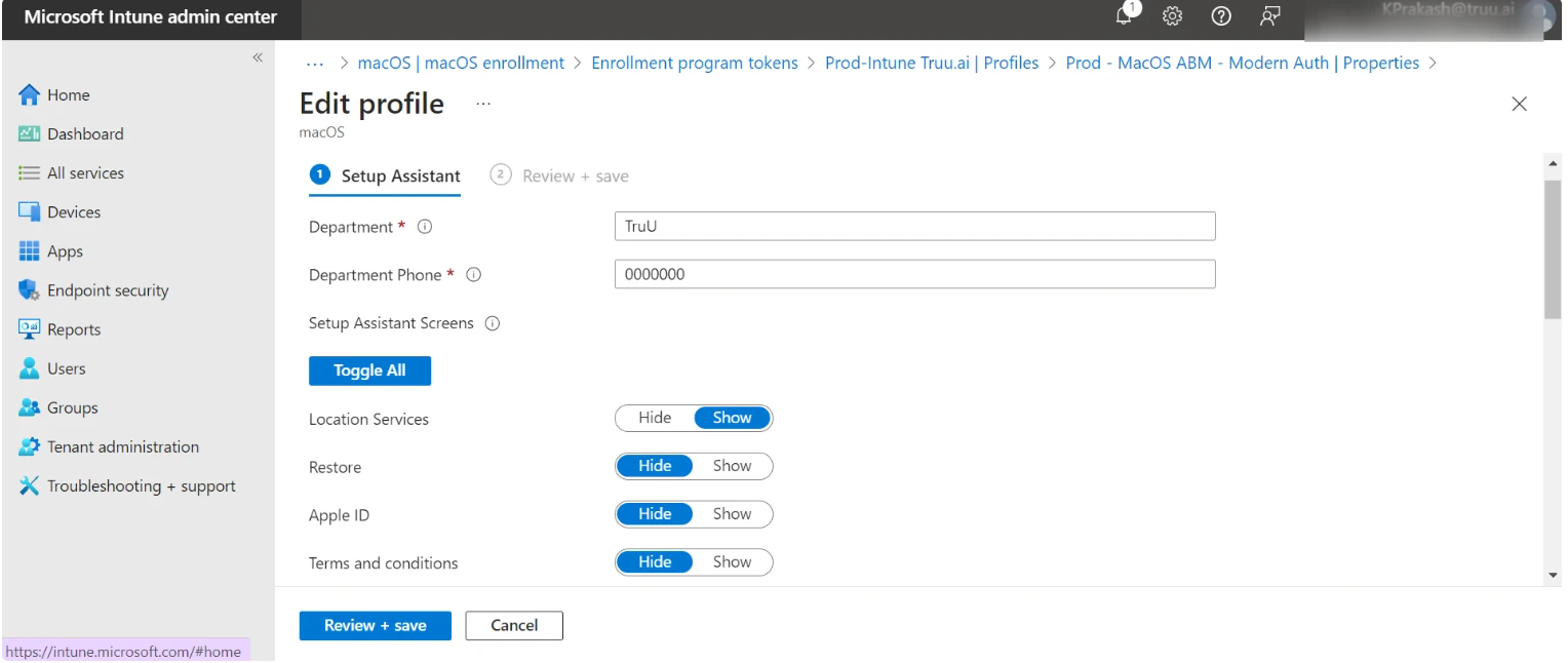 - On the Setup Assistant page, configure the Setup Assistant experience as per your organization needs