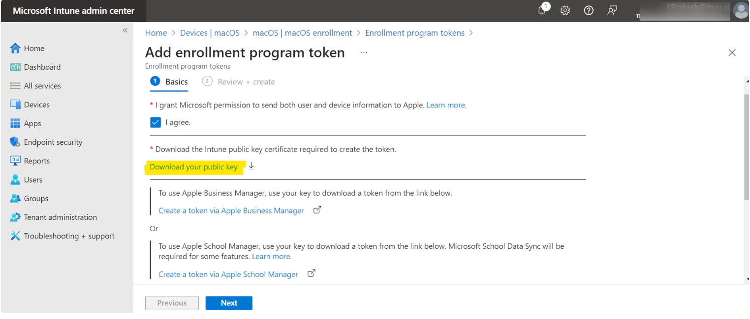 The public key certificate is needed to request a trust-relationship certificate from Apple Business Manager.- In the Microsoft Intune admin center, go to Devices > Enrollment