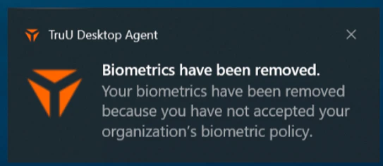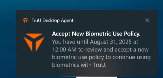 - Windows uses device native notification letting users know that they have to review a biometric use policy. Notifications can be dismissed and will be shown daily until the user has taken an action on the policy. If the user does not take an action and the deadline passes, the user will no longer be able to use biometrics.