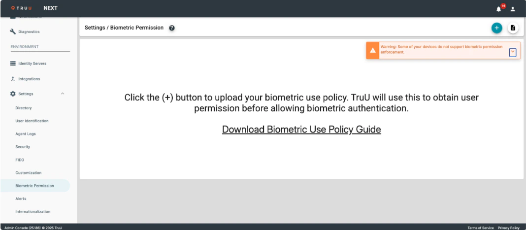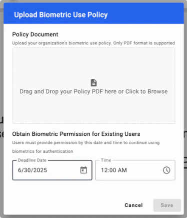 At a high-level, the feature works as follows:- Admins upload a biometric use policy PDF to the platform. If a biometric use policy has not yet been created, the Admin can first download a guide for creating the policy from the settings page.