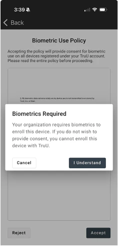 - When users go to add their biometrics to the desktop and mobile clients, they will be presented with the biometric use policy if they have not already granted permission to use their biometrics. NOTE: users can remove/add permission at anytime through an enrolled desktop/mobile client and/or the User Portal.