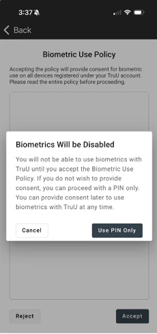 - When “Device Biometrics” is enabled AND “Allow PIN Only” is set, users may enroll their biometrics if they wish to.