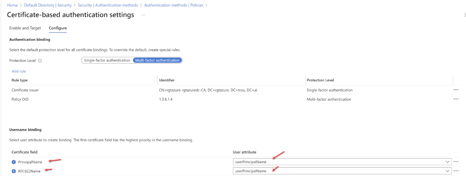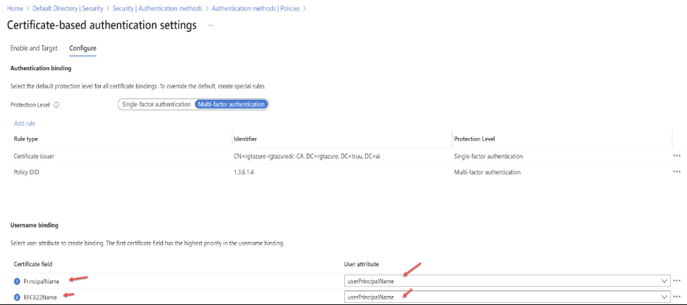 - To set up username binding, one must choose from the available X.509 certificate fields and associate them with corresponding user attributes. The order in which username bindings are arranged is significant because it establishes the hierarchy of priority. The top binding in the list is given the highest precedence. If the authentication system locates the designated X.509 certificate field within the certificate and fails to match it with a user object, the authentication will not succeed. In this scenario, Microsoft Entra ID ceases further attempts with subsequent bindings. It is only when the specific X.509 certificate field is absent from the certificate that the system proceeds to the next priority level