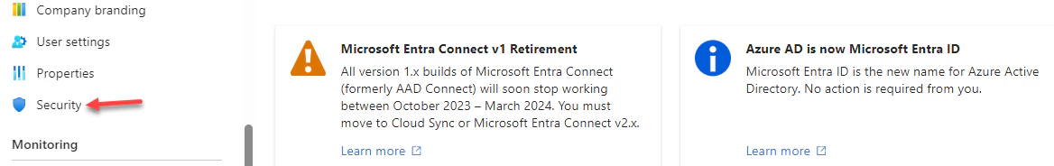 - Navigate to Microsoft Entra ID (formerly Azure Active Directory), and on the left-hand menu, select Security