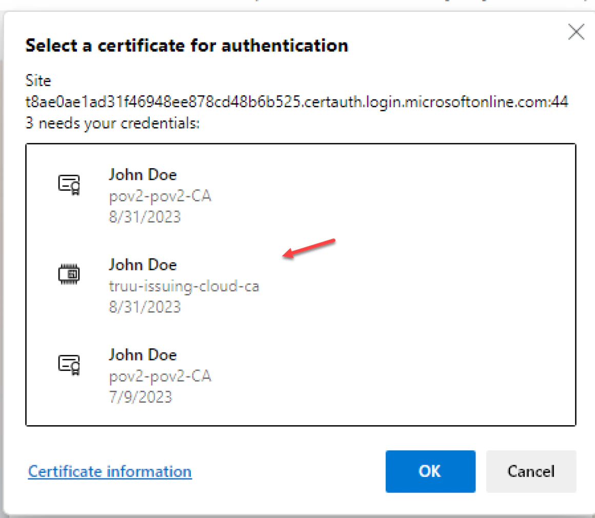 - It is worth mentioning that users might encounter a certificate prompt during their first login attempt. This prompt can be managed through a registry key or a group policy which can suppress the certificate selection prompt if so desired
