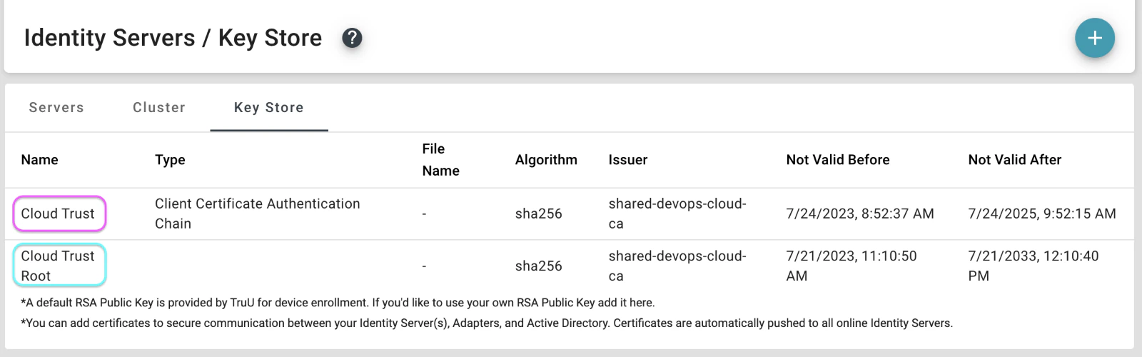 Note: You will need to have the certificates and URLs prepared ahead of time in order to supply this information into the CA setup- In the TruU admin console navigate to the “Identity Servers” tab, then go to the “Key Store” page and search for Cloud Trust entries for Root and client certificate authentication chain entries and download the certificates