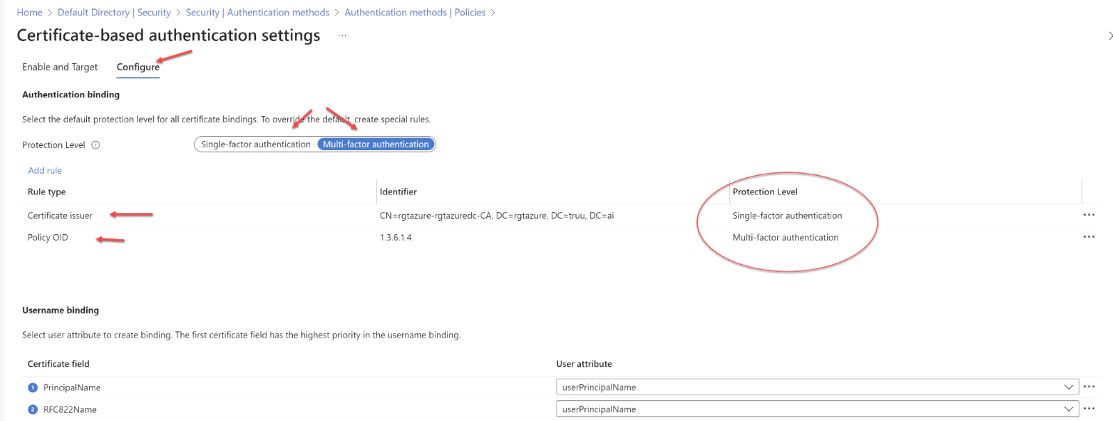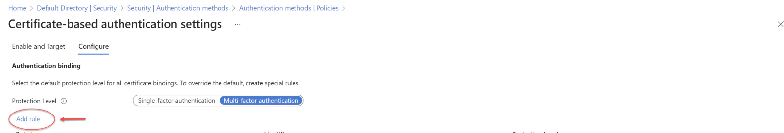 - We can enhance security by setting up custom authentication binding rules, which determine the protection level required for client certificates. These rules can be based on the certificate’s issuer Subject or Policy OID fields. Essentially, authentication binding rules associate certificate attributes—either issuer or Policy OID—with a specified value, establishing a default protection level for that rule. It’s possible to create multiple rules to meet various security requirements. To introduce custom rules, one should navigate to the “Add Rule” option
