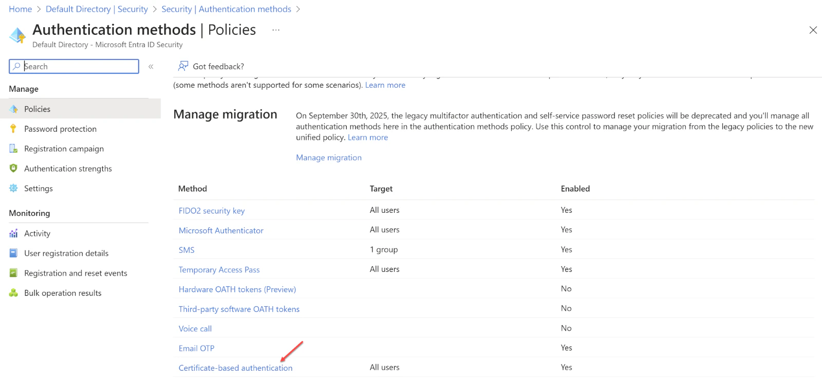 - Under the “Manage” category, locate and select Authentication methods followed by Certificate-based Authentication
