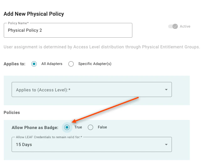 - Allow LEAF Credential to remain valid for: This policy provides added security for physical access for readers that use the LEAF standard. The policy sets a time to live for an issued LEAF credential so that mobile devices cannot keep a valid credential indefinitely. The policy enables selecting pre-defined periods from 8 hours to 15 days. LEAF credentials are automatically extended when the mobile device is online and checks in (no action required by the user).
