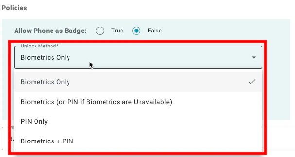 Unlock Method: This is a nested policy that appears when “Allow Phone as Badge” is set to “True”. The available options are: