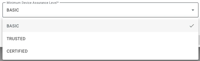 Minimum Device Assurance Level: This setting defines the required assurance level for the authenticating device for the user to access the resource. The available options are:
