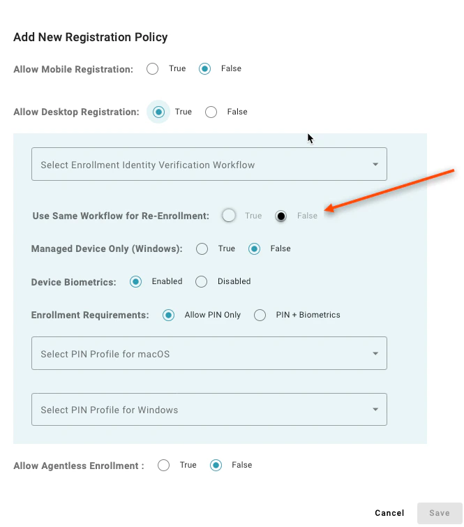 By setting this to “False”, you can specify a different enrollment workflow for a first time user vs an existing user. For example, you might wish to allow a new hire to enroll with a password on their first day, but then use a passwordless flow for enrollment thereafter