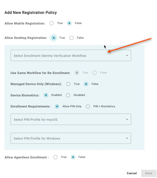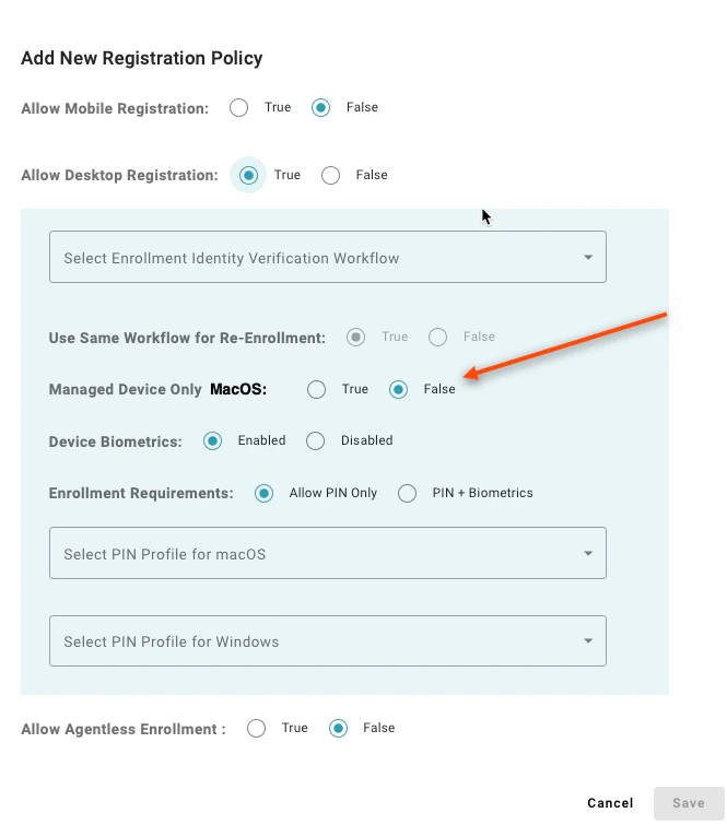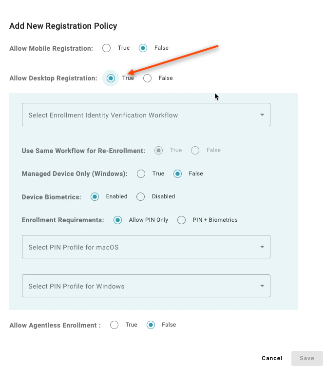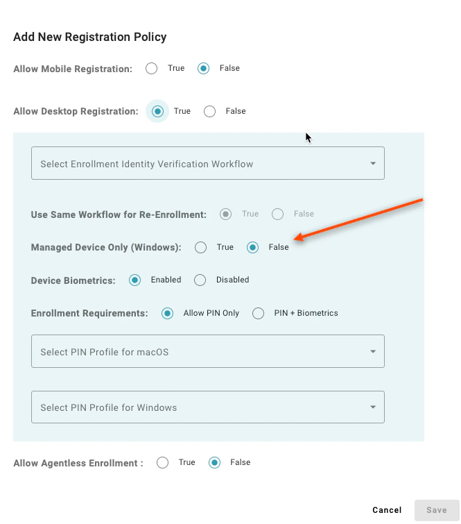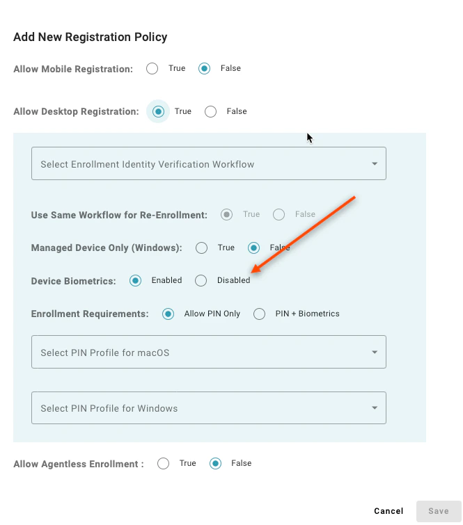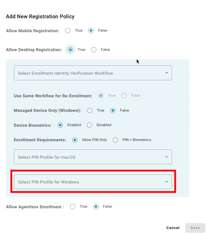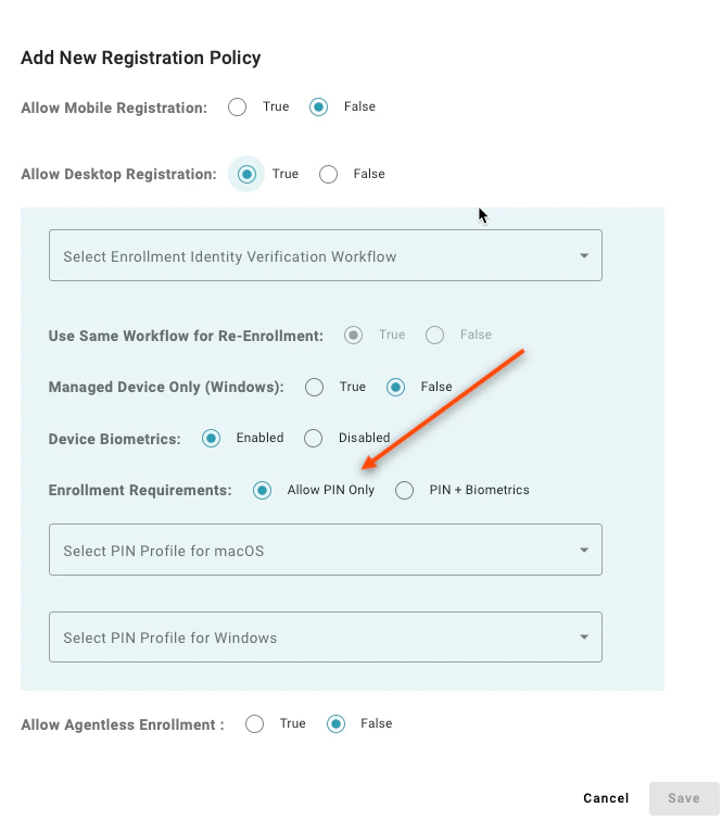 Setting to “Allow PIN Only” enables users to register a desktop authenticator that does not have supported biometrics to enroll. A value of “PIN + Biometrics” will prevent users from enrolling a desktop authenticator if the device does not have supported biometrics