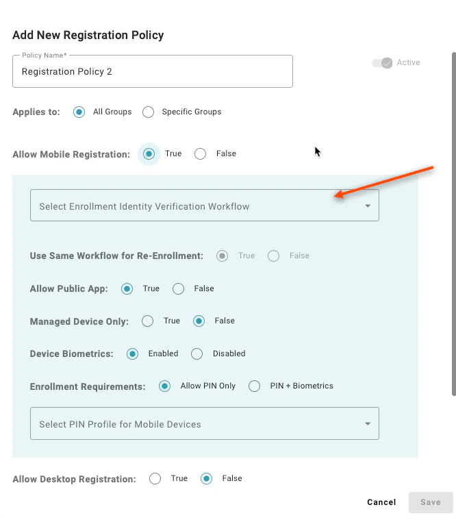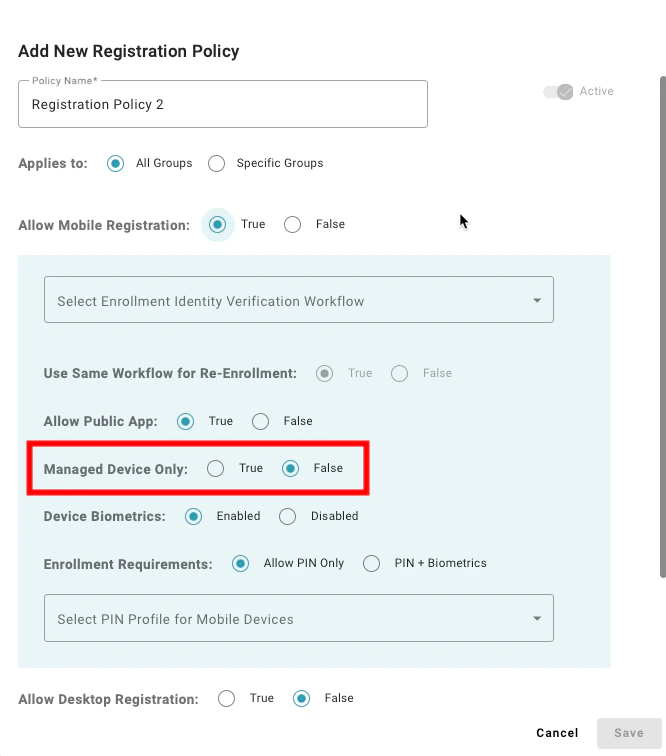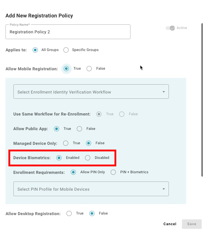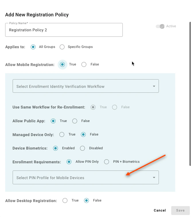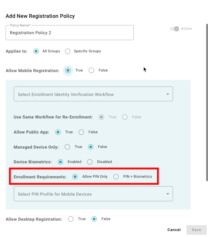 Setting to “Allow PIN Only” enables users to register a mobile device that does not have supported biometrics to enroll. A value of “PIN + Biometrics” will prevent users from enrolling a mobile device if the device does not have supported biometrics