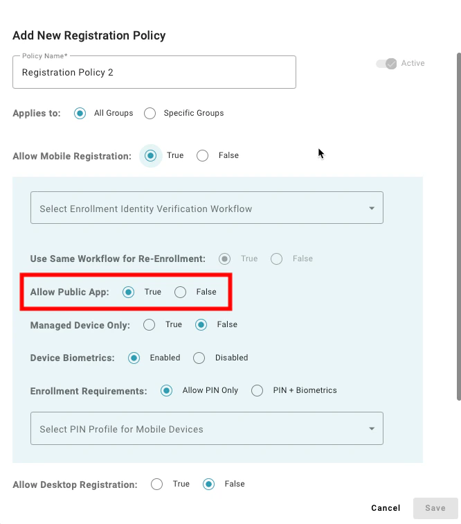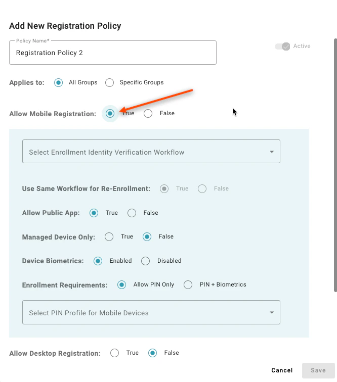 Setting to “True” enables users in the matching group to register a mobile app, with TruU as an authenticating device. A value of “False” will prevent users from registering