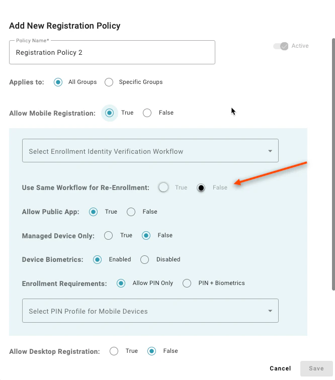 By setting this to “False” you can specify a different enrollment workflow for a first time user vs an existing user. For example, you might wish to allow a new hire to enroll with a password on their first day, but then use a passwordless flow for enrollment thereafter