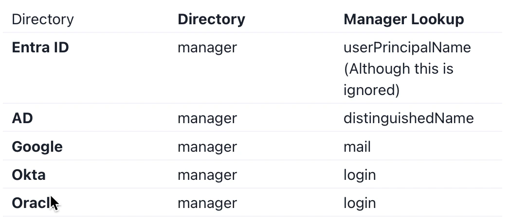 - Entra ID: Entra ID has a special api call for retrieving the manager. If the Entra ID attribute configured as the “Manager” attribute is “manager” then the second attribute will be ignored