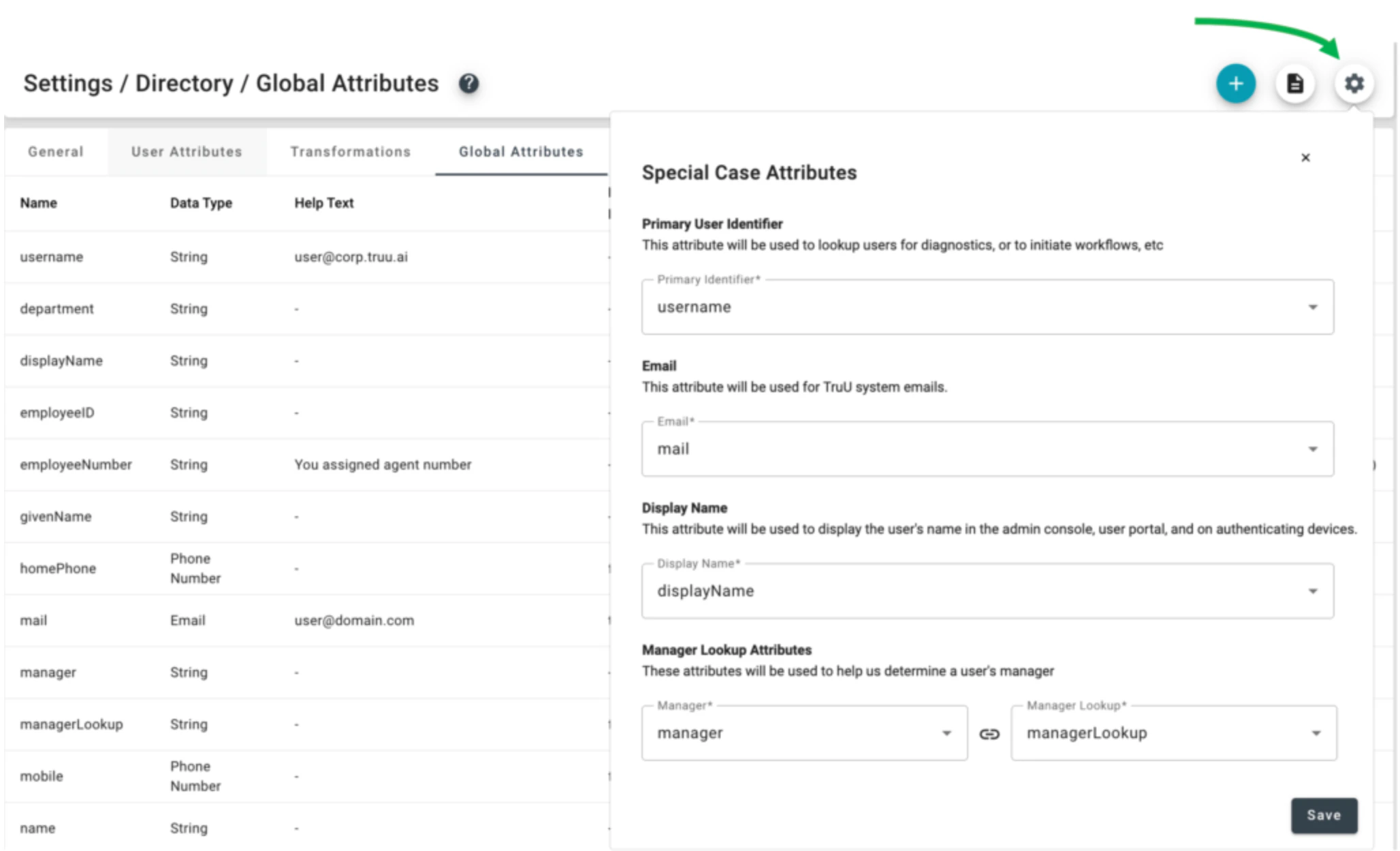 - Manager Lookup Attributes: this allows you to specify which user attribute your directory uses to indicate who is the manger and which attribute TruU should use to look up the manager in the directory. When using cloud directories to lookup a user’s manger (either for sending an invitation or for routing an identity verification request), the way in which the manager attribute may be stored can vary