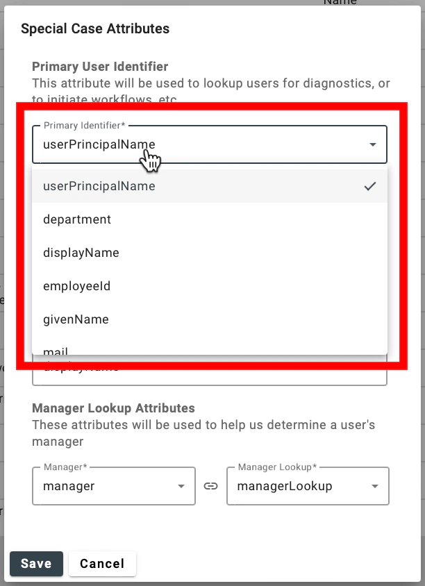 - Primary User Identifier: this is the attribute that is used for user search in the Admin Console and the primary attribute that is used to identify a user in all identity verification workflows