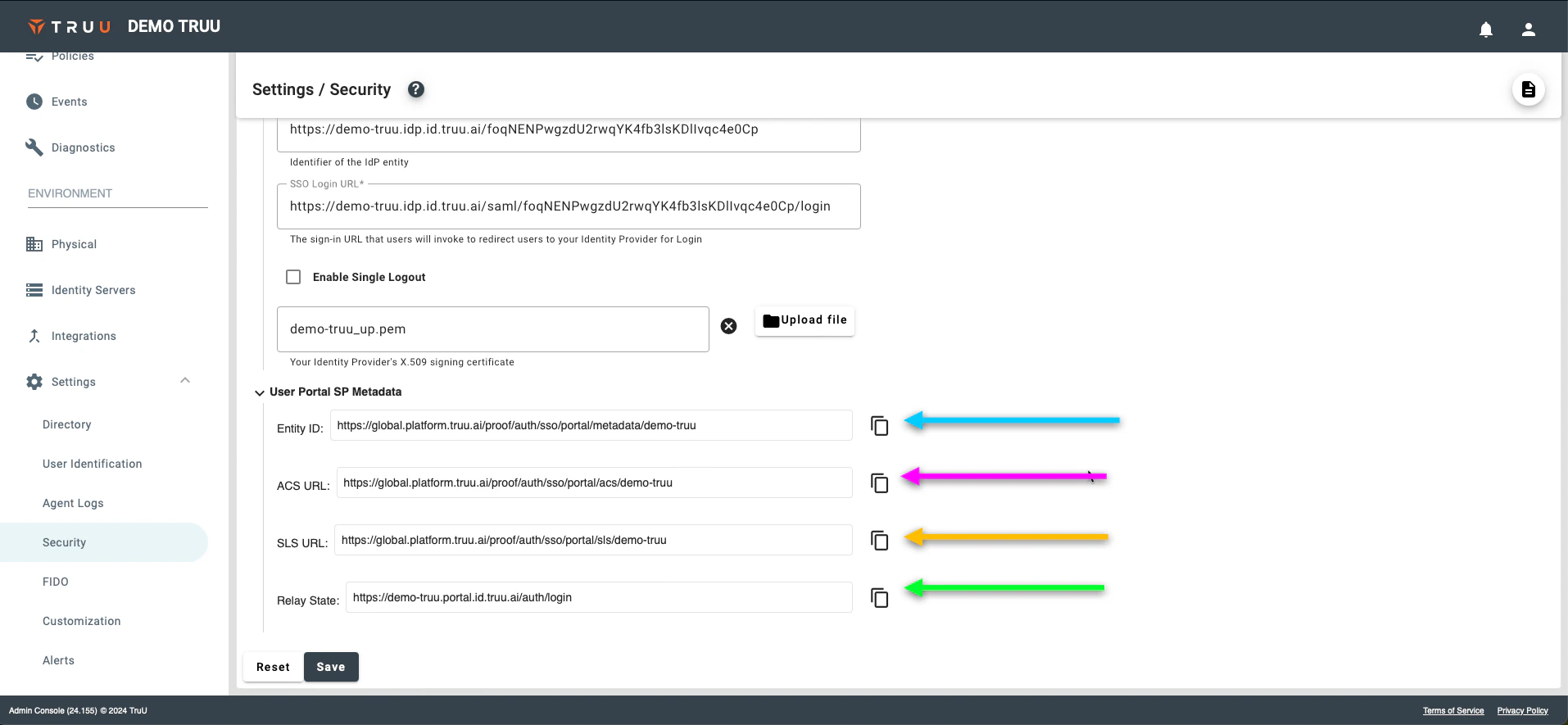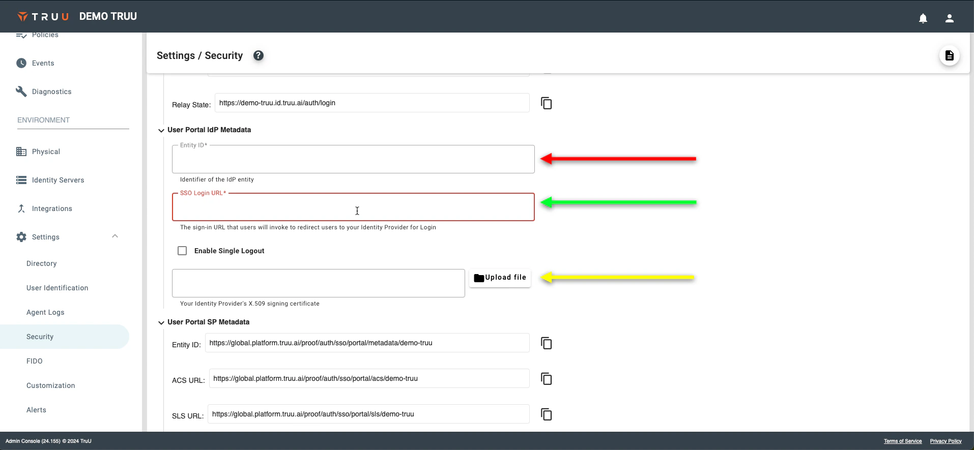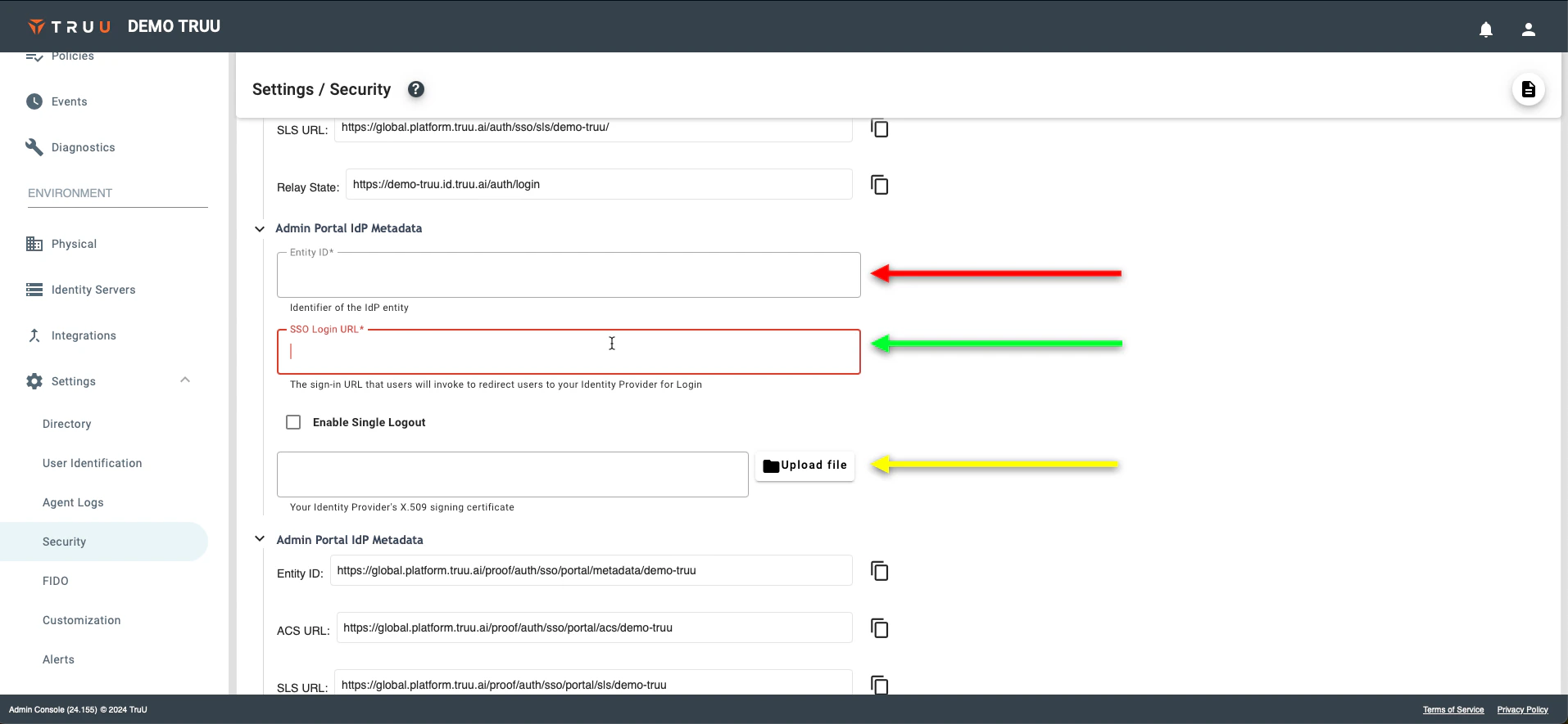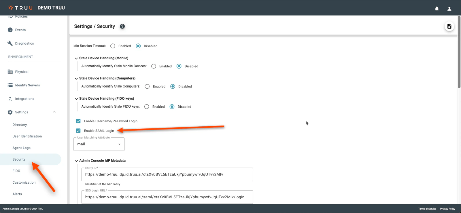 - Return to the TruU Admin Console and navigate to the “Settings” → “Security” tabs under the “Environment” section and then select Enable SAML Login