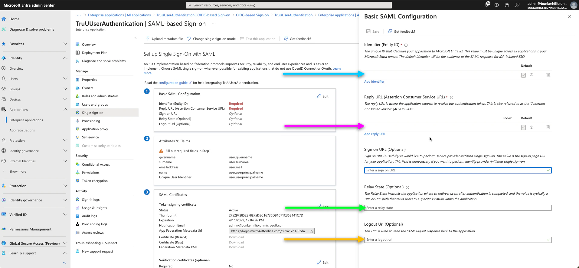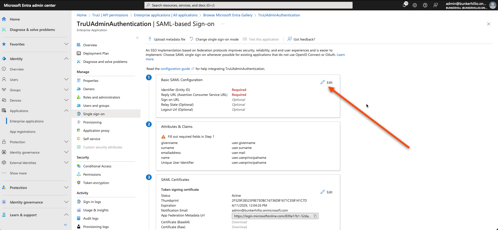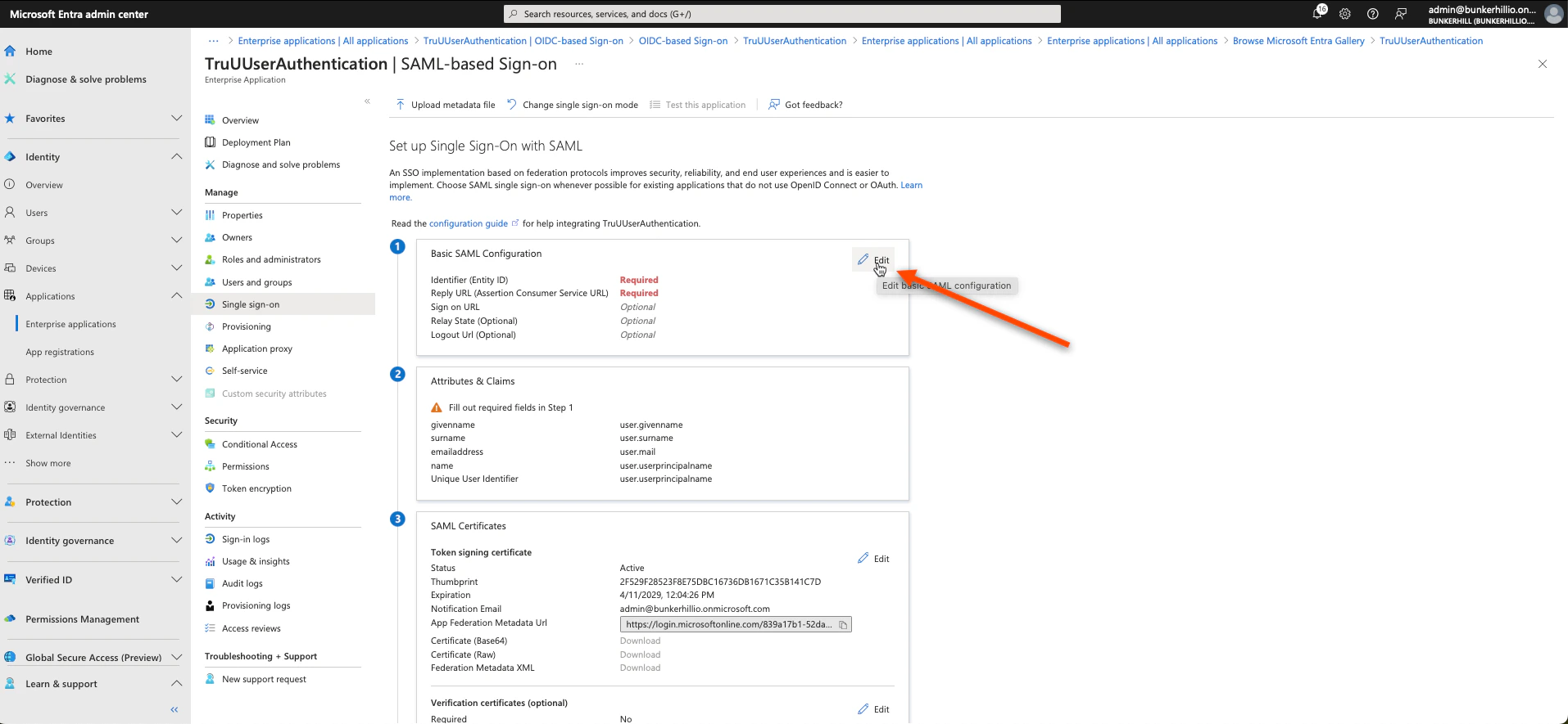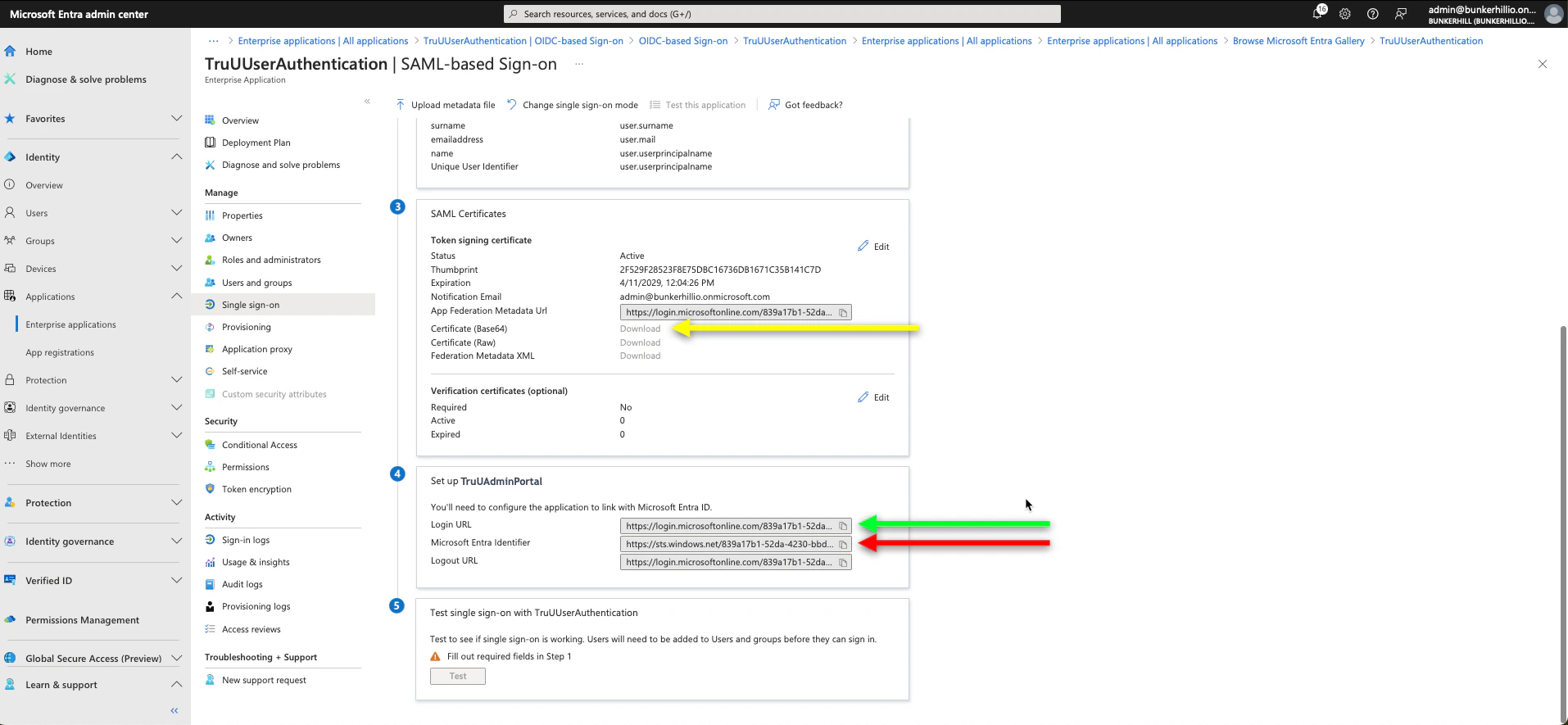 - Scroll down on this same page to the 3rd and 4th boxes; as we need the Login URL, Microsoft Entra Identifier, and Certificate (Base64)