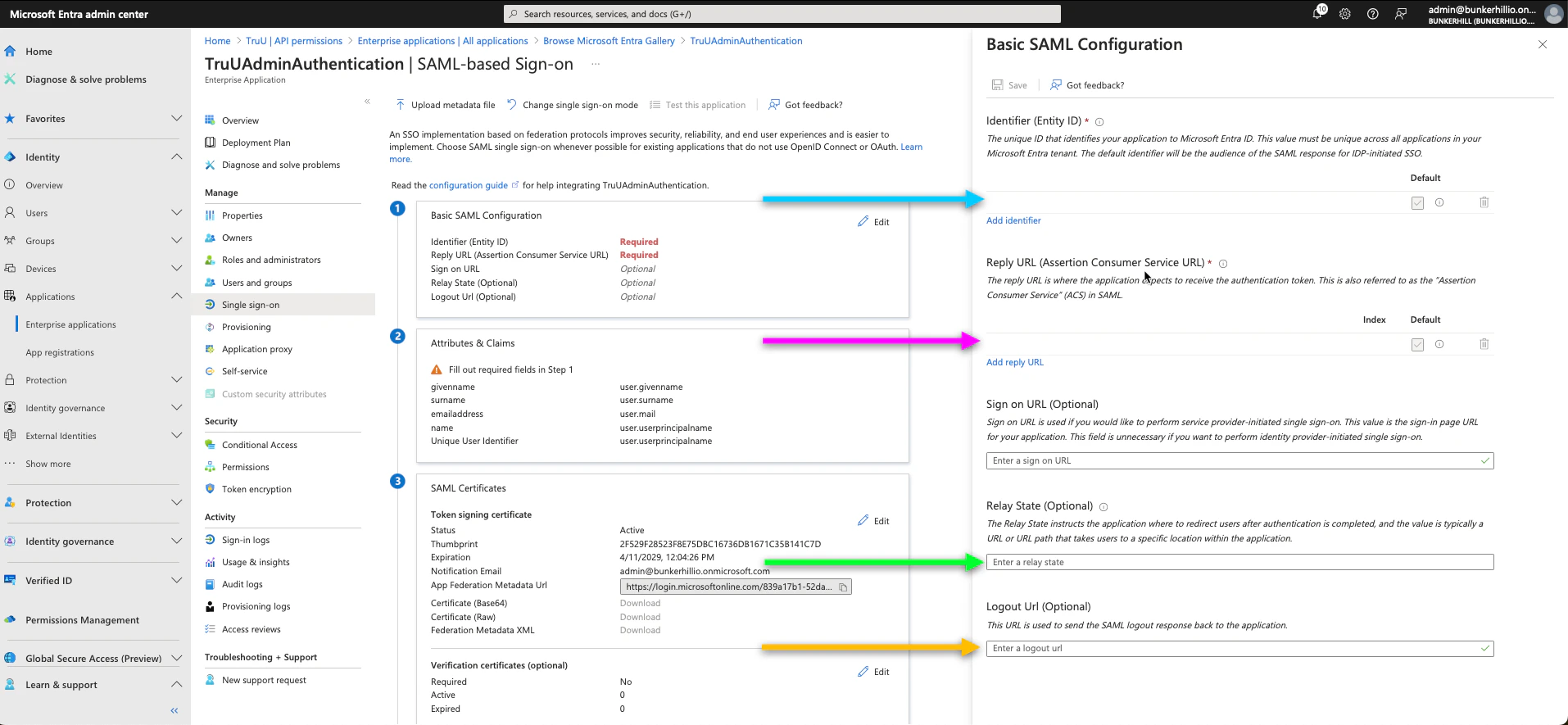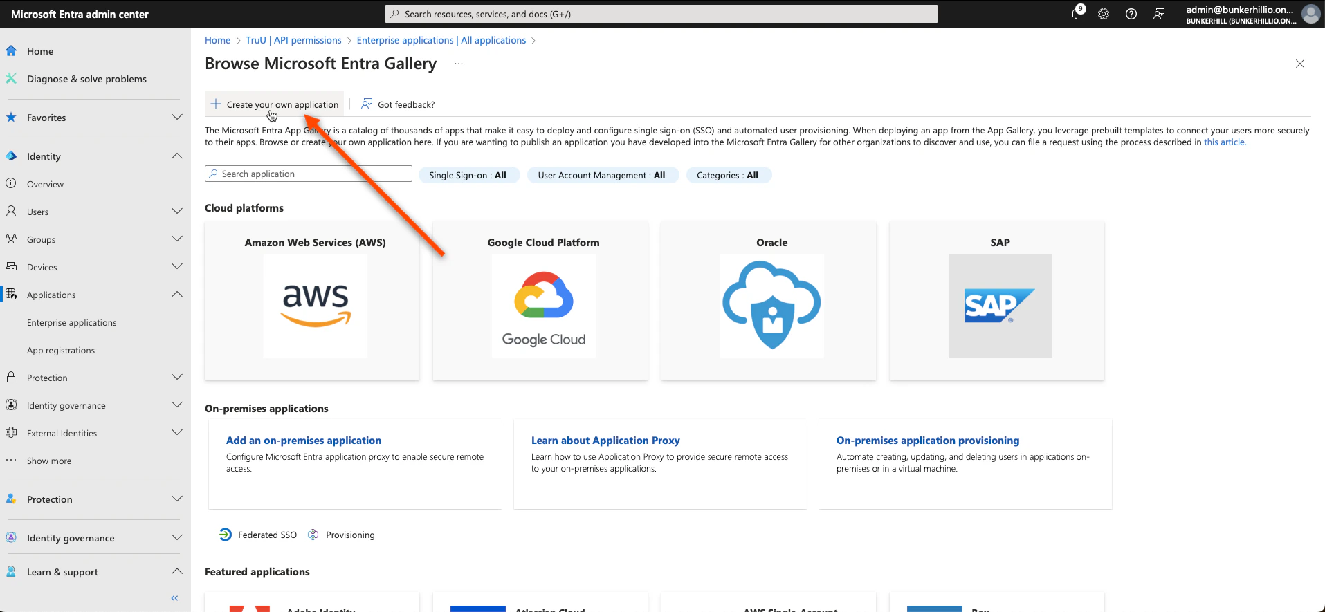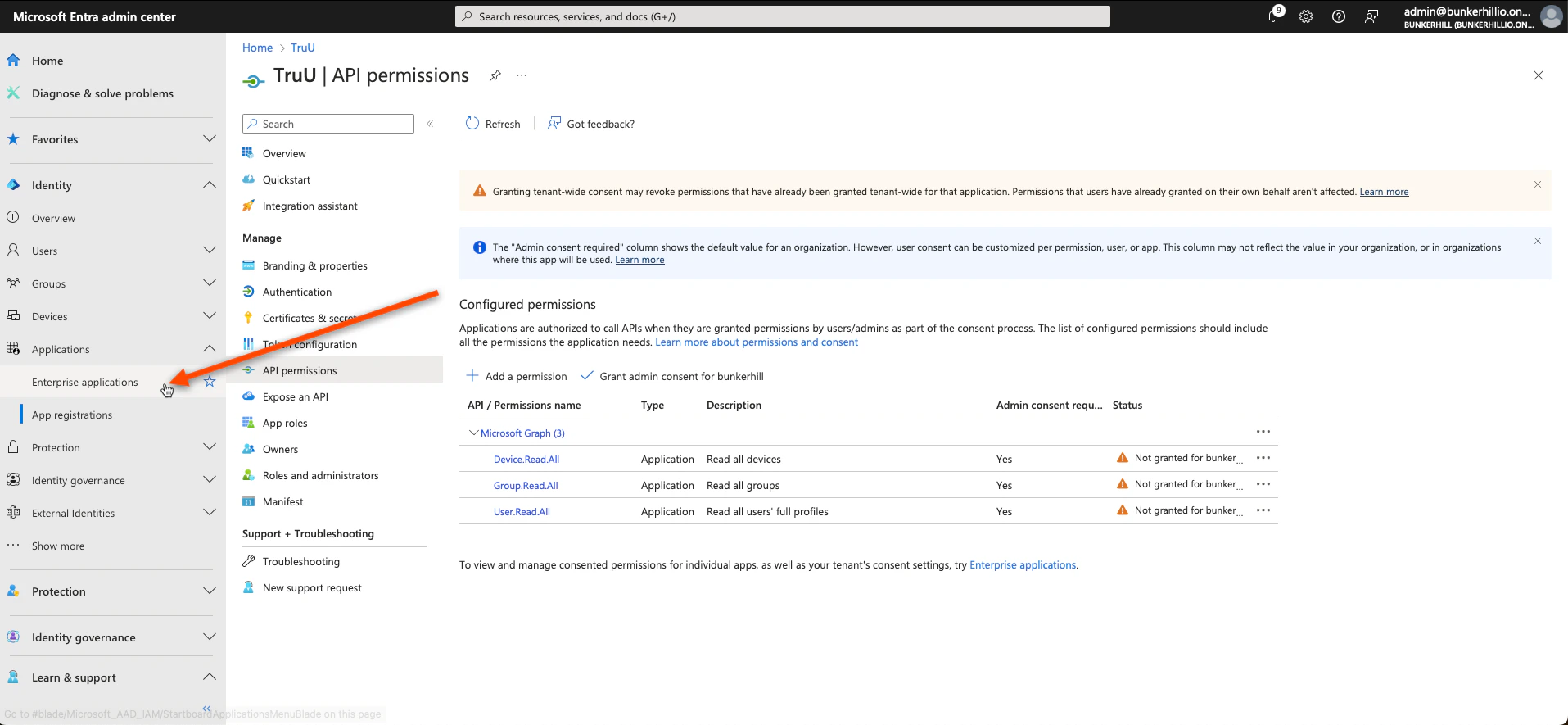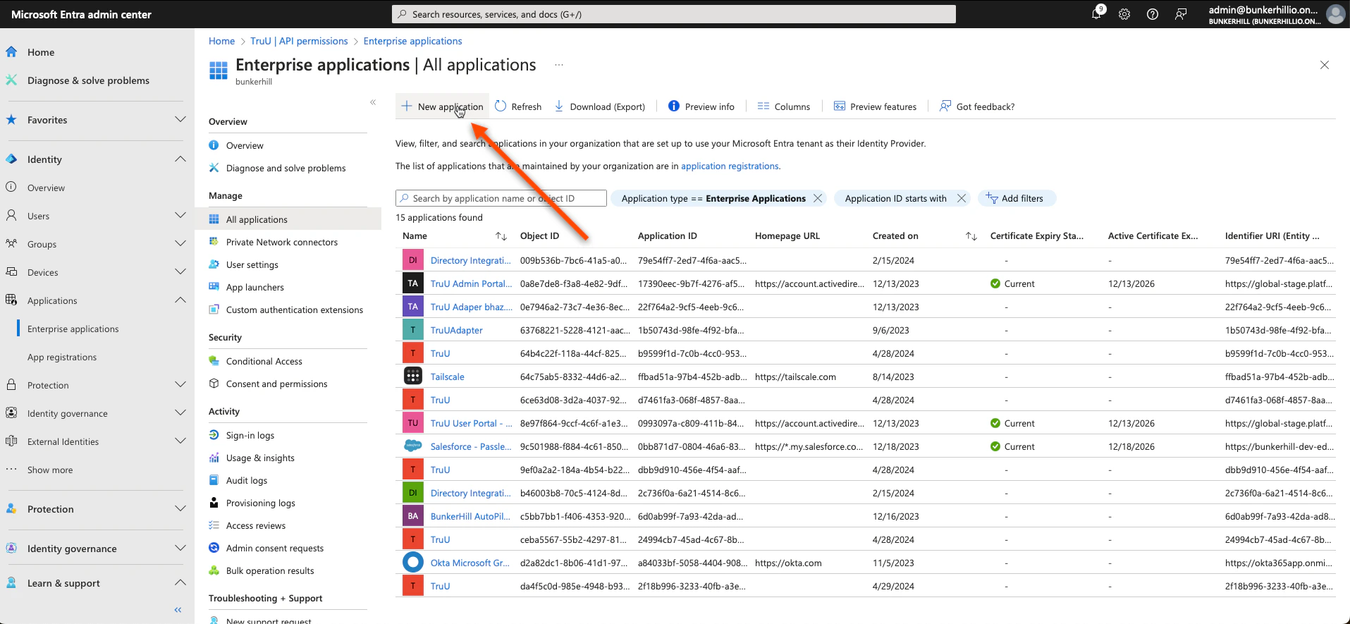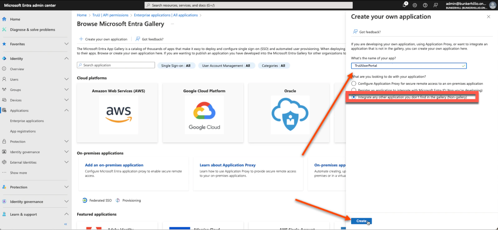 - Once all of these steps have been completed, you will have created your TruU Admin Portal. To do so for a User Portal, we essentially replicate the same steps as we did before (as seen below). First, navigate back to the Entra ID admin center. Click Enterprise Applications under the “Applications” tab on and follow the picture prompted steps below