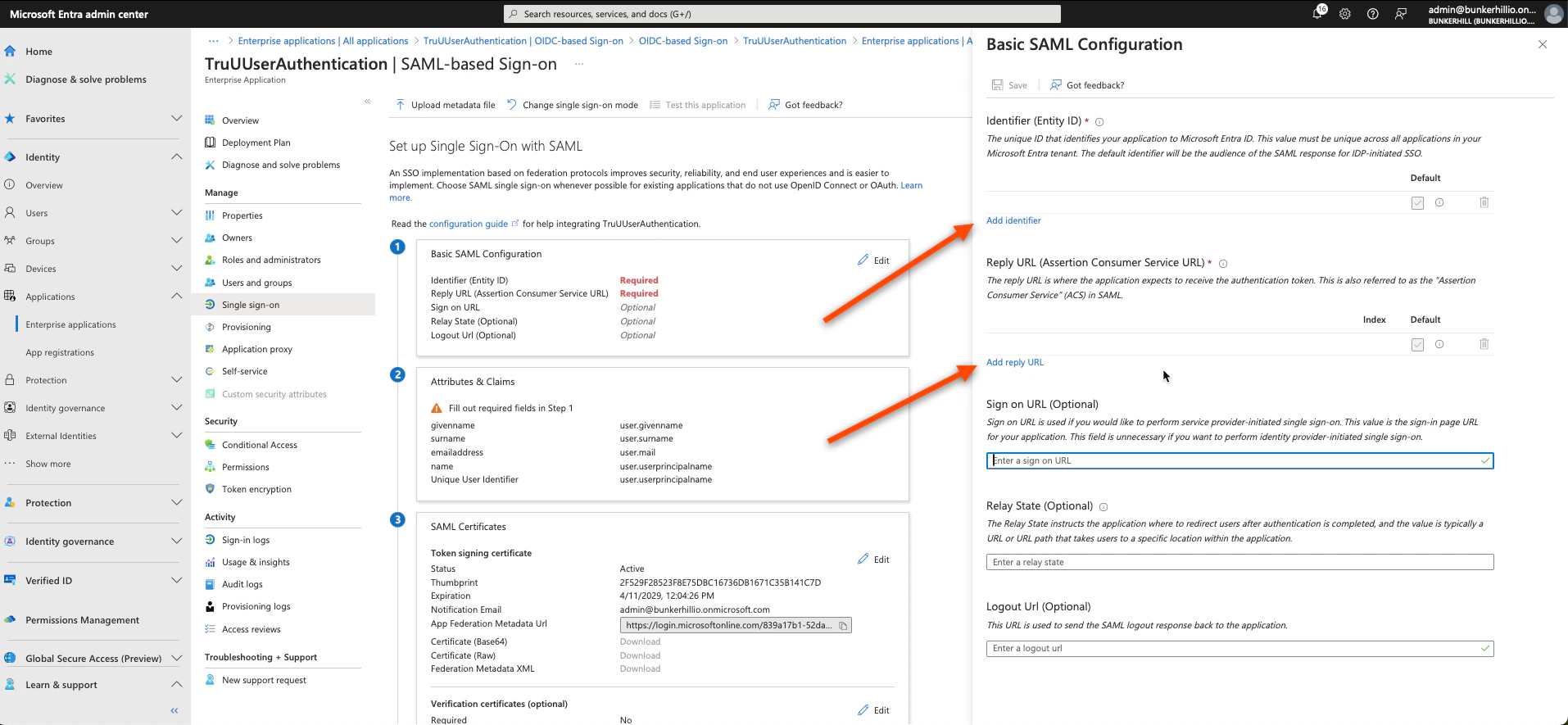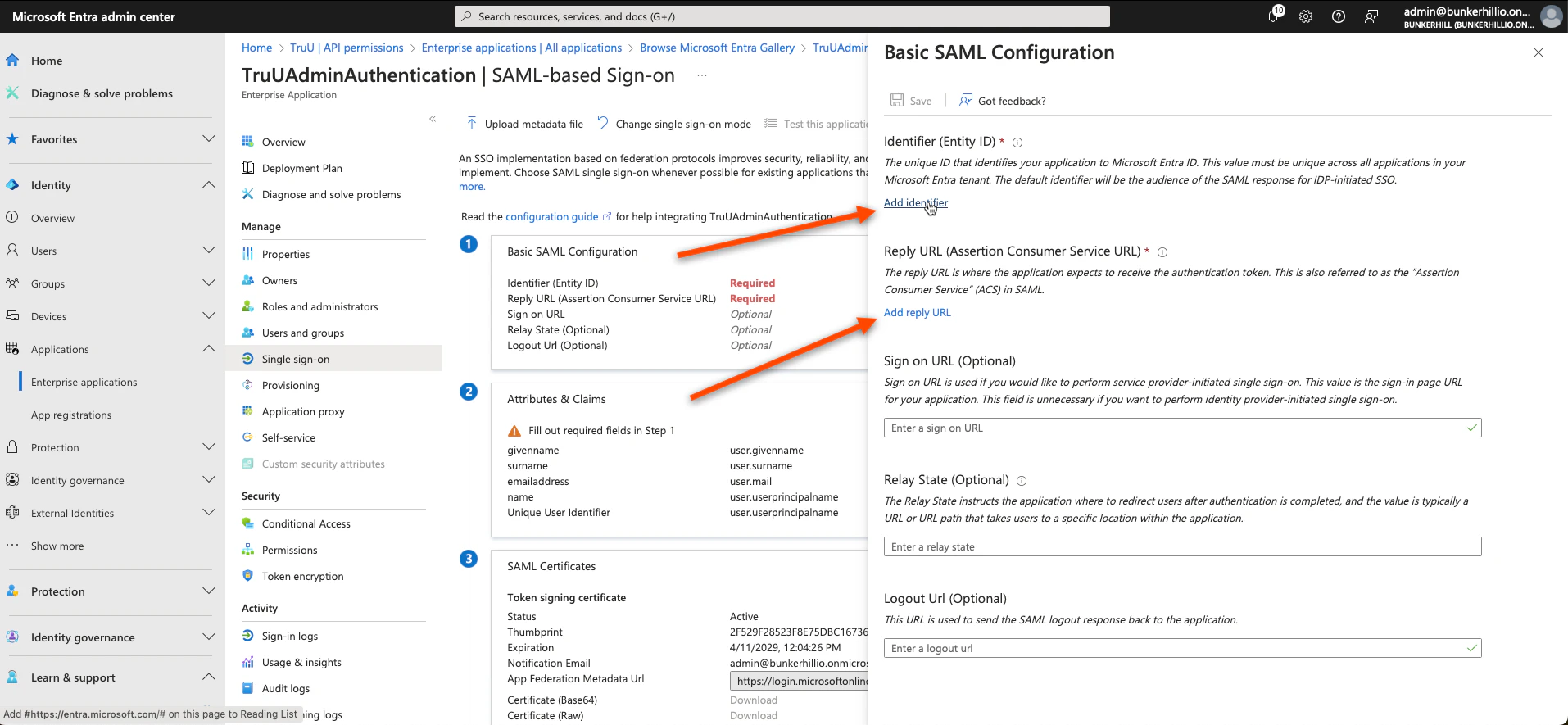 - Click Add Identifier and Add Reply URL and follow the steps below to get the values you need