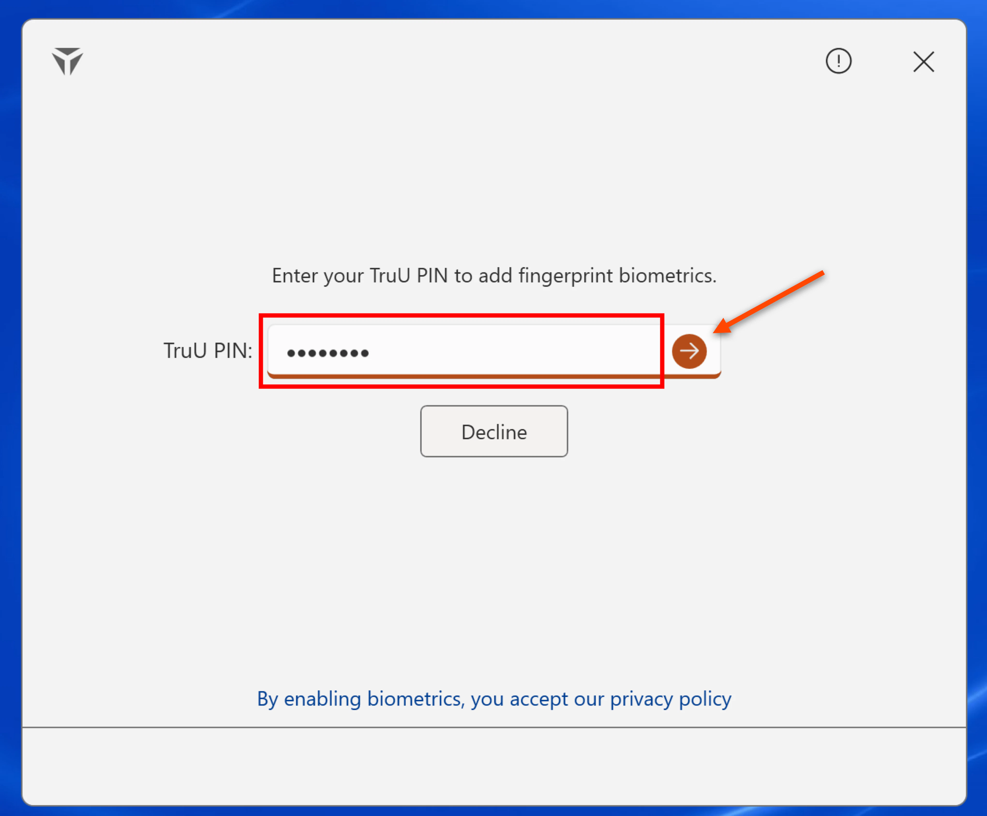 - Enter your TruU PIN to add fingerprint biometrics, then click the arrow