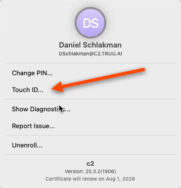 - On your Mac, Click on the TruU icon on the top right of the Menu Bar (If TruU icon is not appearing and enrollment menu is not appearing, run the following command in terminal:
