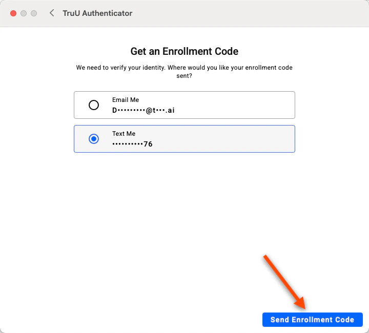 - Select either your email or your phone number to receive your enrollment code, then click Send Enrollment Code