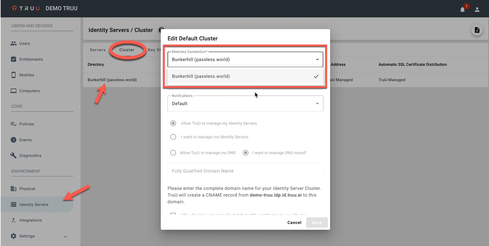 - Navigate to “Identity Servers”> Cluster. Under Directory Connection, select your directory and Click Save.