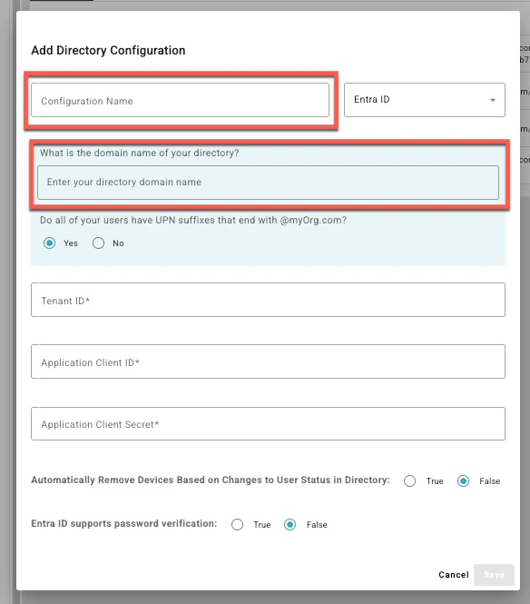 - Set a Configuration Name along with the domain name (your Entra ID domain) of the directory that you will be integrating