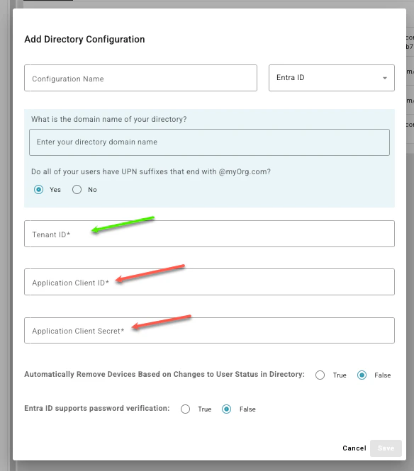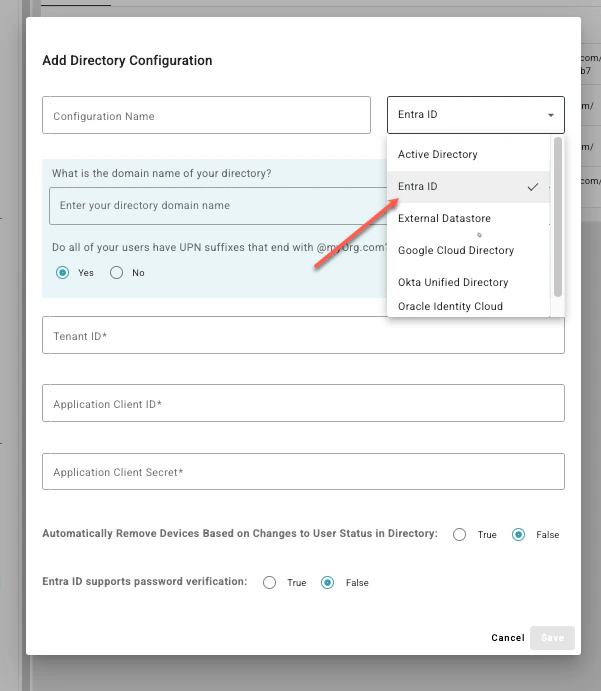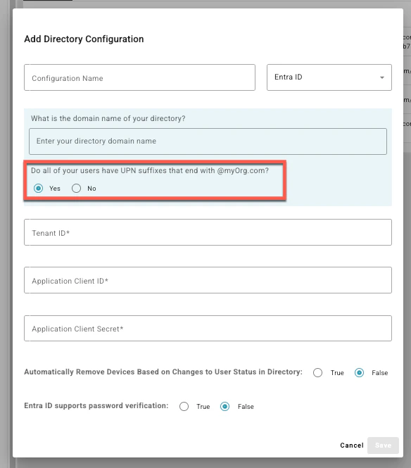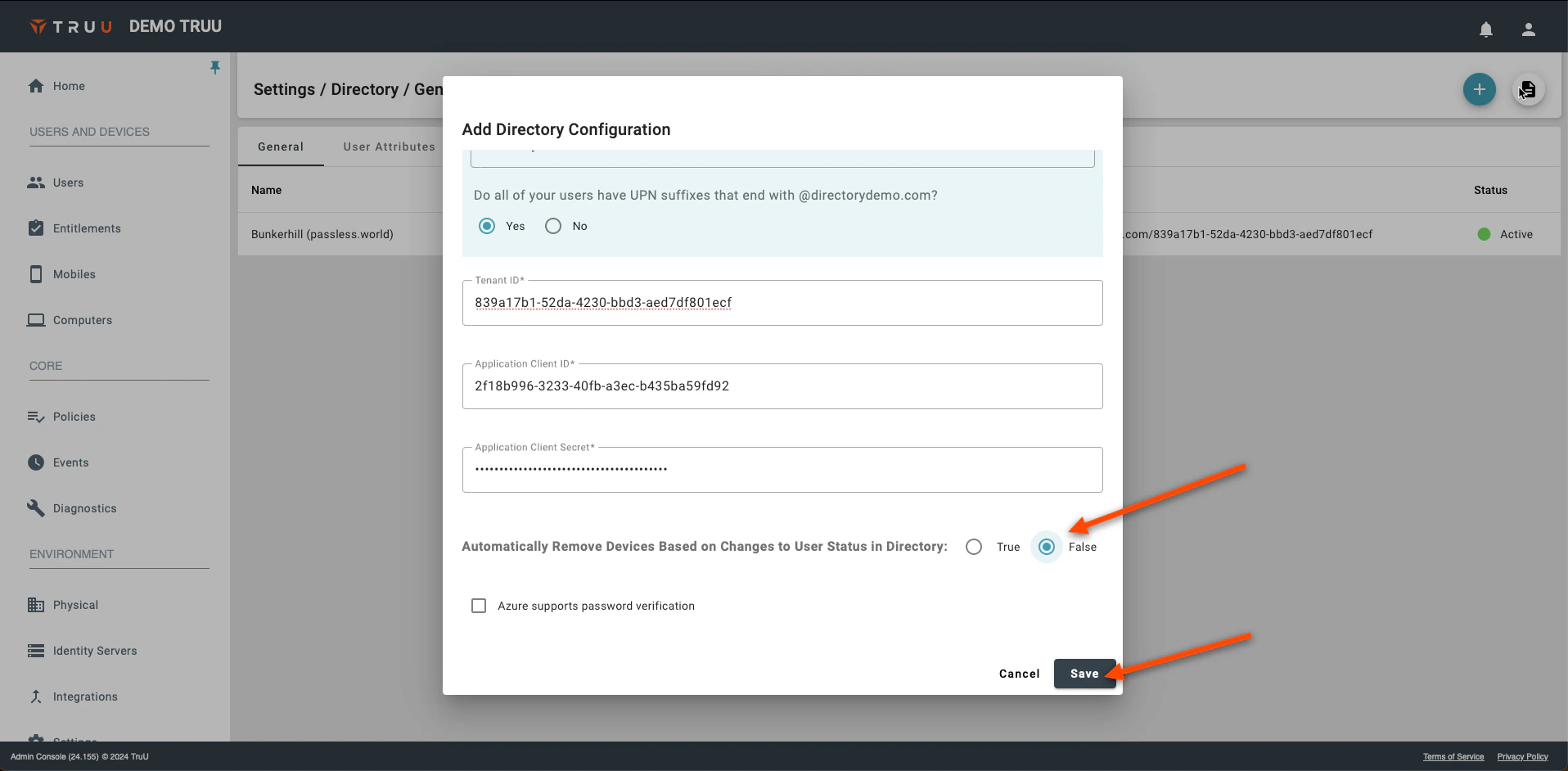 - Choose True or False to determine if the system should automatically unenroll or remove devices based on user status changes in the directory, then click Save
