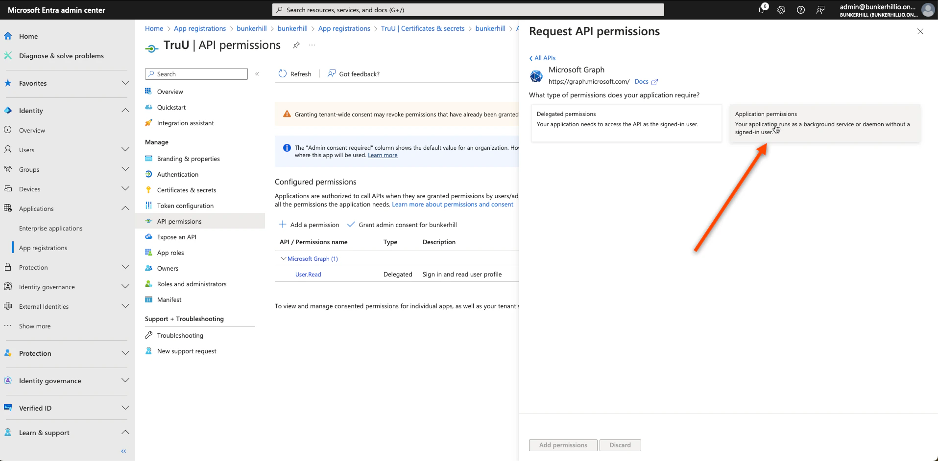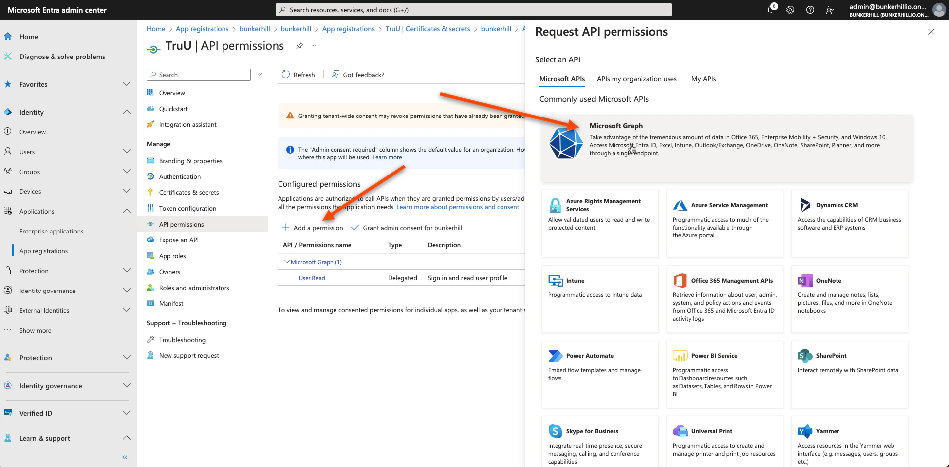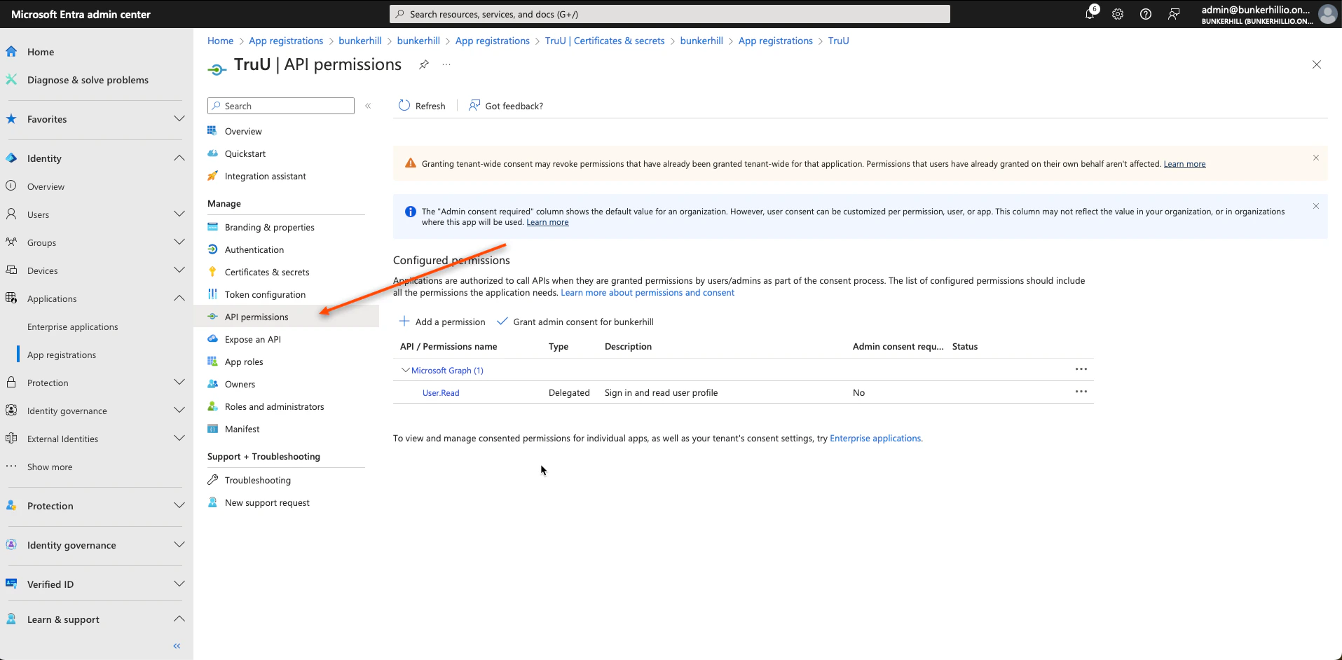 - Now, navigate back to the Entra ID Admin page and select API permissions