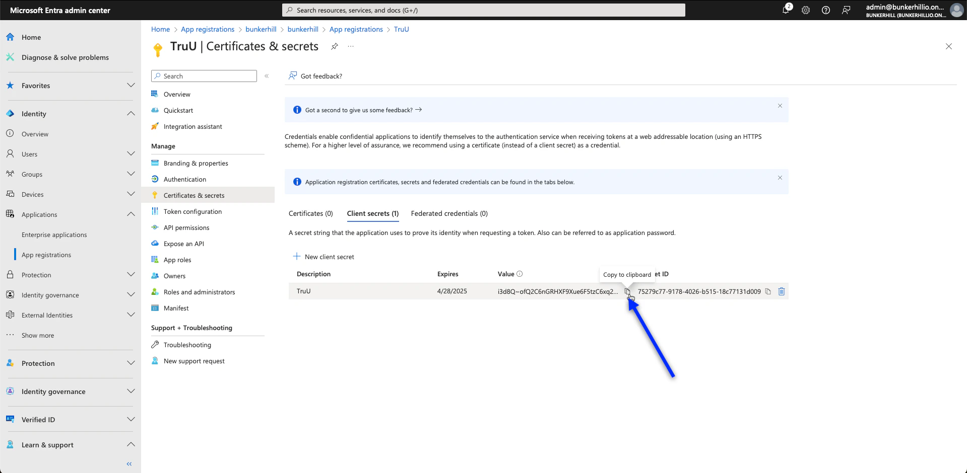 - After adding the secret, immediately copy the entry in the Value column and save it. This value is required for the integration in the TruU Admin Console and will not be accessible again once you leave the page.