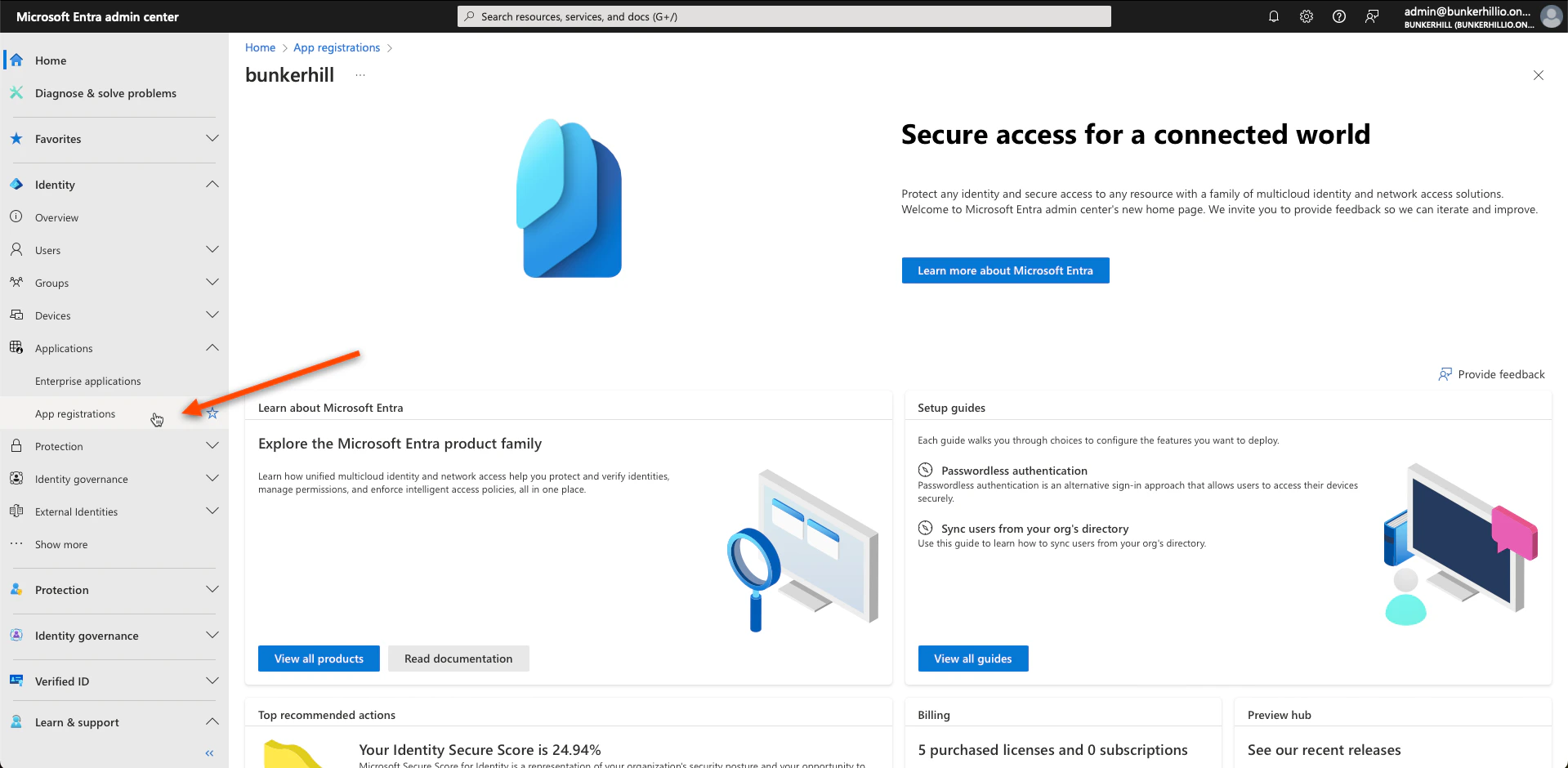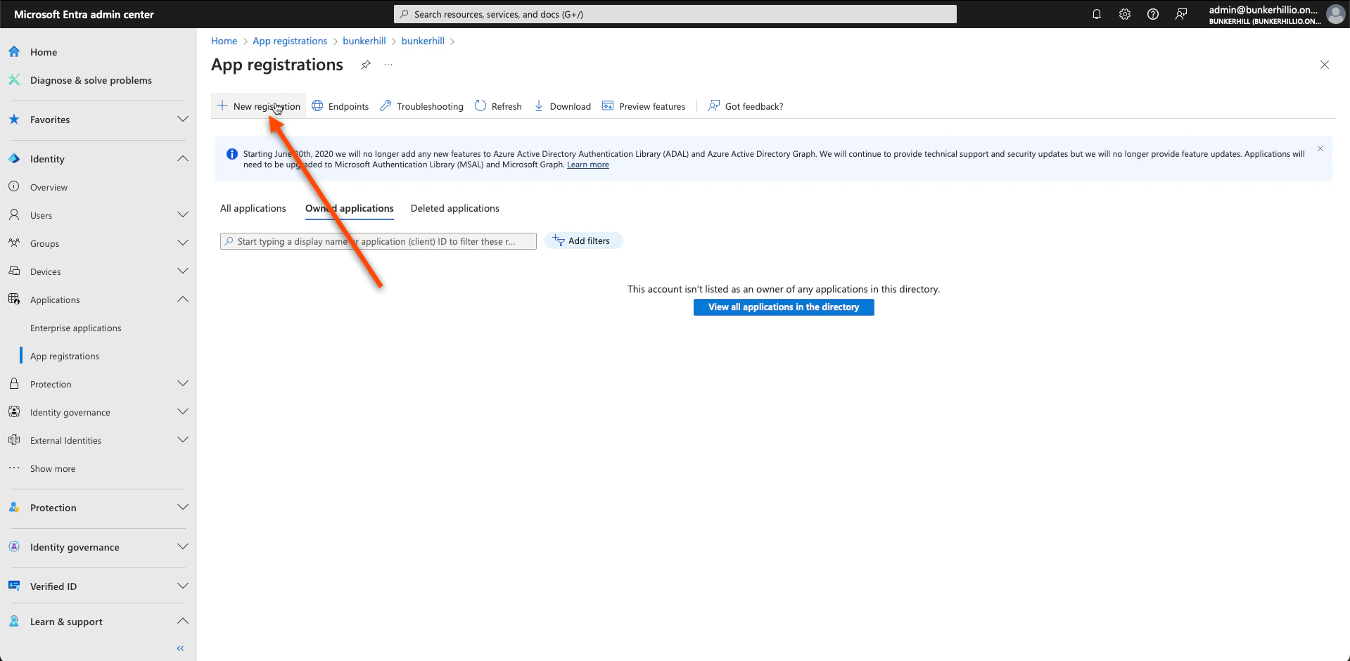 - Navigate to your Microsoft Entra ID admin center and select the App Registrations tab under the Applications drop down menu