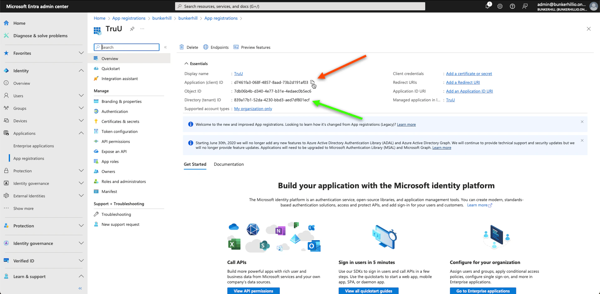 - Go back to the Entra ID Admin Center and locate the Application (client) ID and the Directory (tenant) ID on the application’s overview page. Copy and paste the: