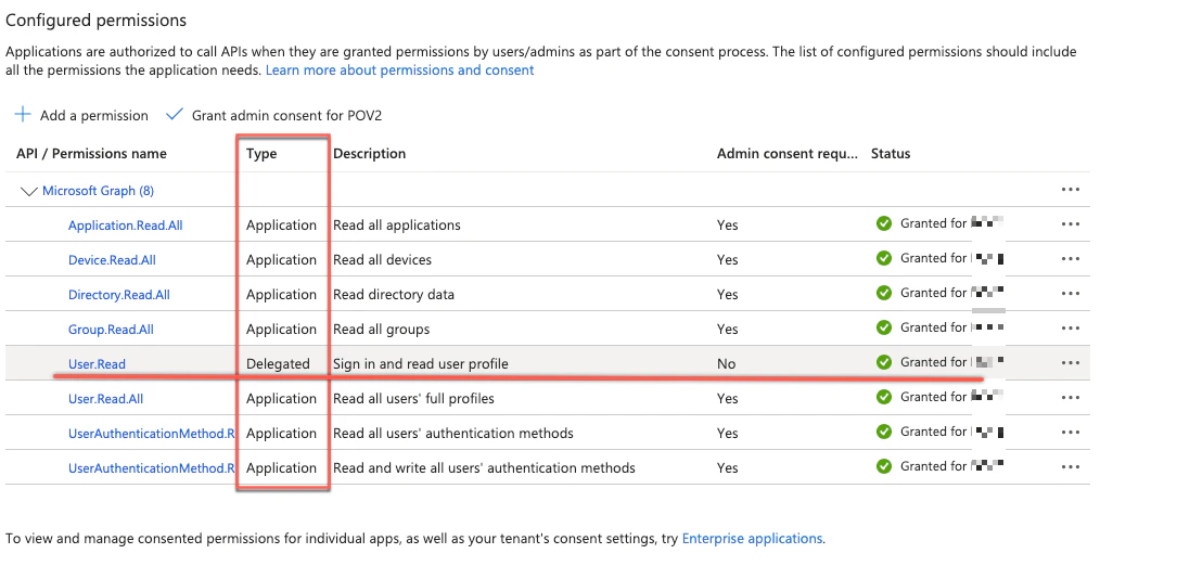 - Select Application permissions and grant admin consent for the following specific requirements: