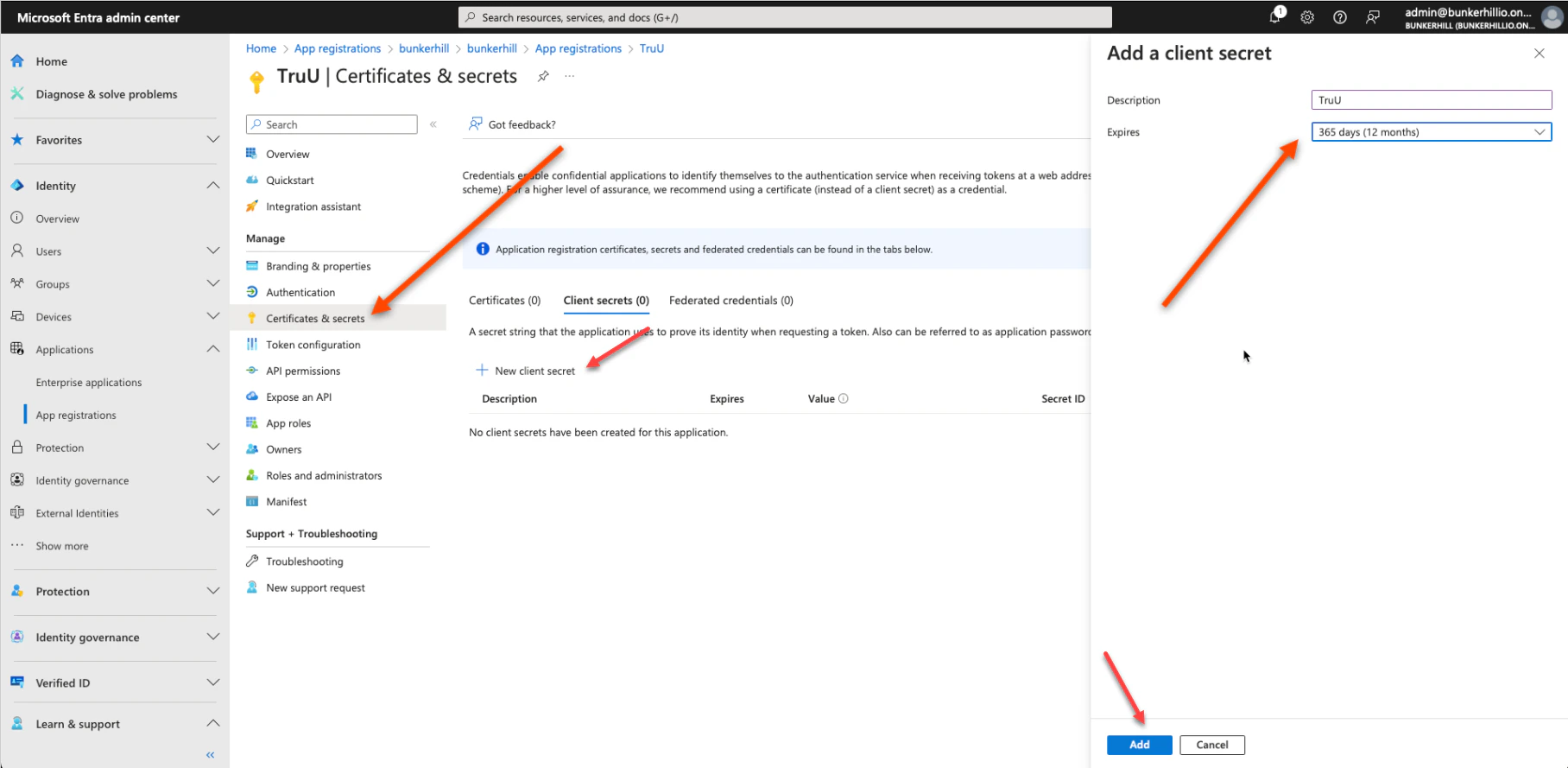 - Navigate to Certificates & secrets, select New client secret, and enter “TruU” as the description. Set the expiration to your preference; a 12-month duration is recommended.