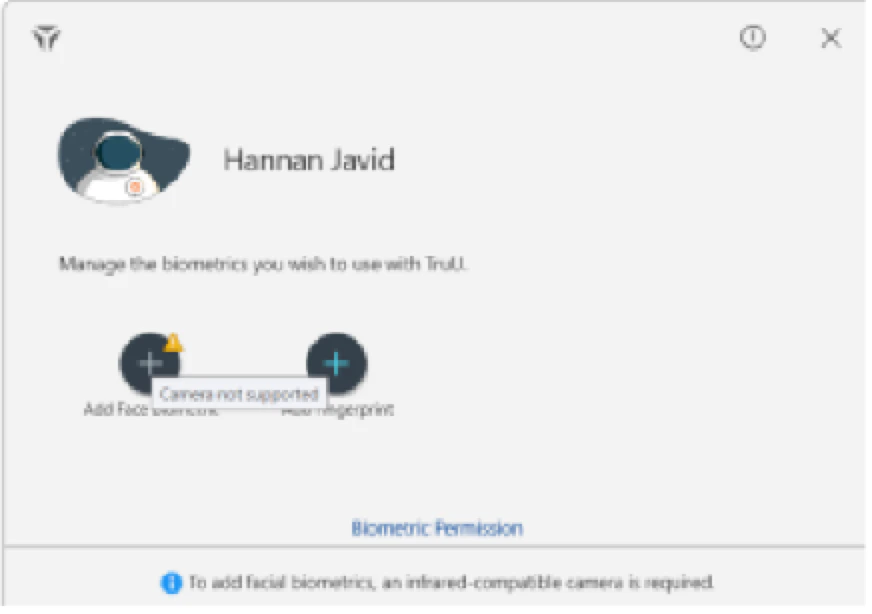 - If an external camera is connected, TruU will always use it for both enrolment and authentication, even if your laptop lid is open and its internal camera is available.