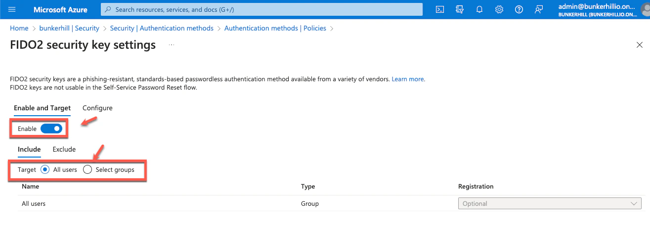 - Click on FIDO2 Security Keys and enable it for all users or selected users in a group and Save the settings