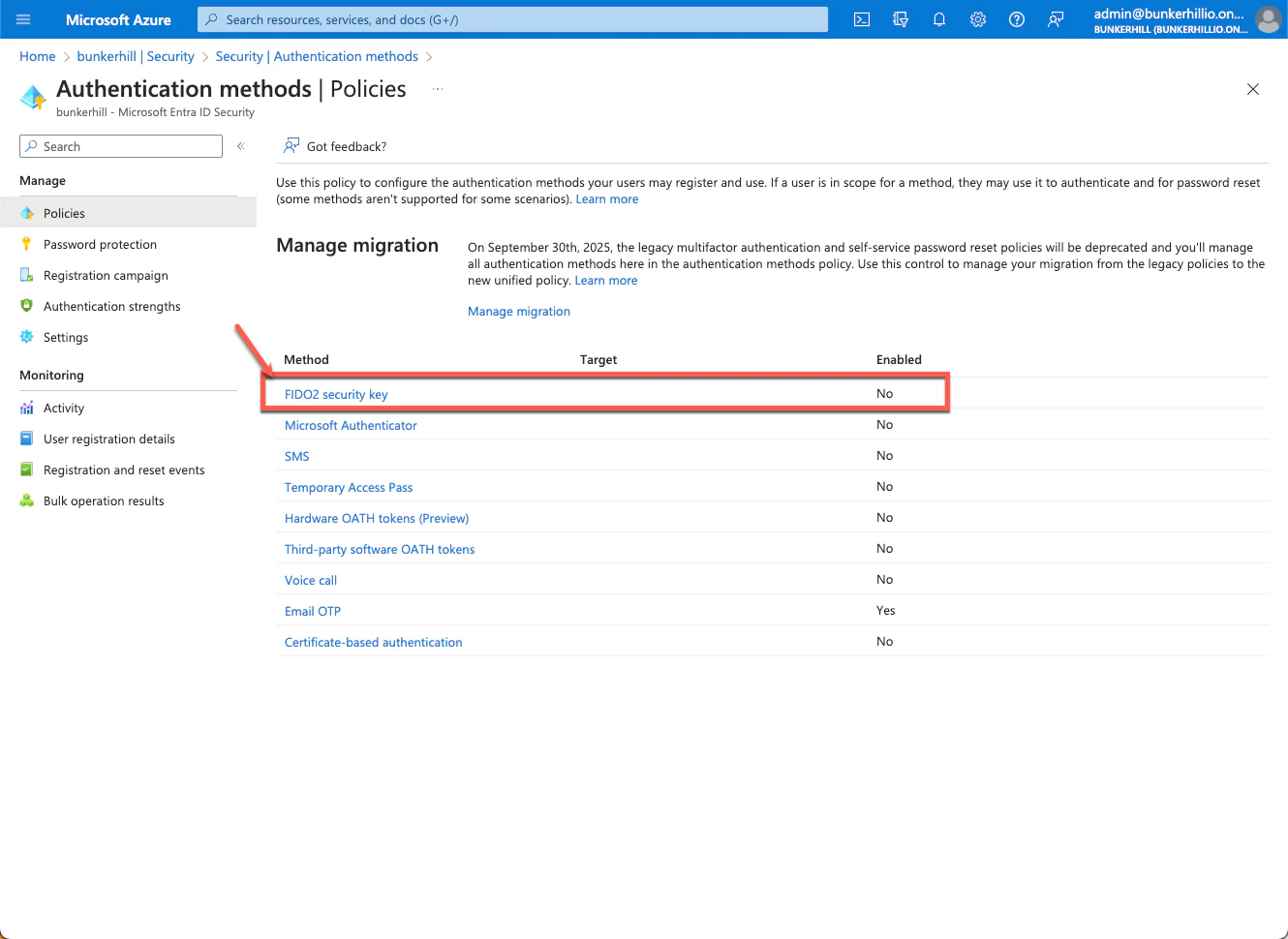 Enable FIDO2 Security Keys in Azure Portal