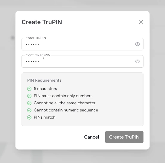 - Create your TruPIN. Ensure it meets all the PIN requirements listed below