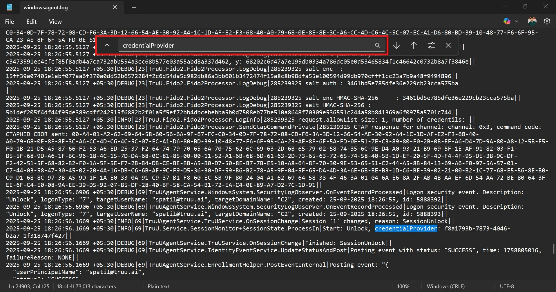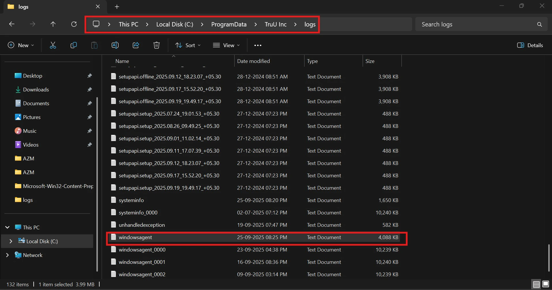 - Follow the path to access TruU logs on the machine “C:\ProgramData\TruU Inc\logs” and open the latest Windows agent logs