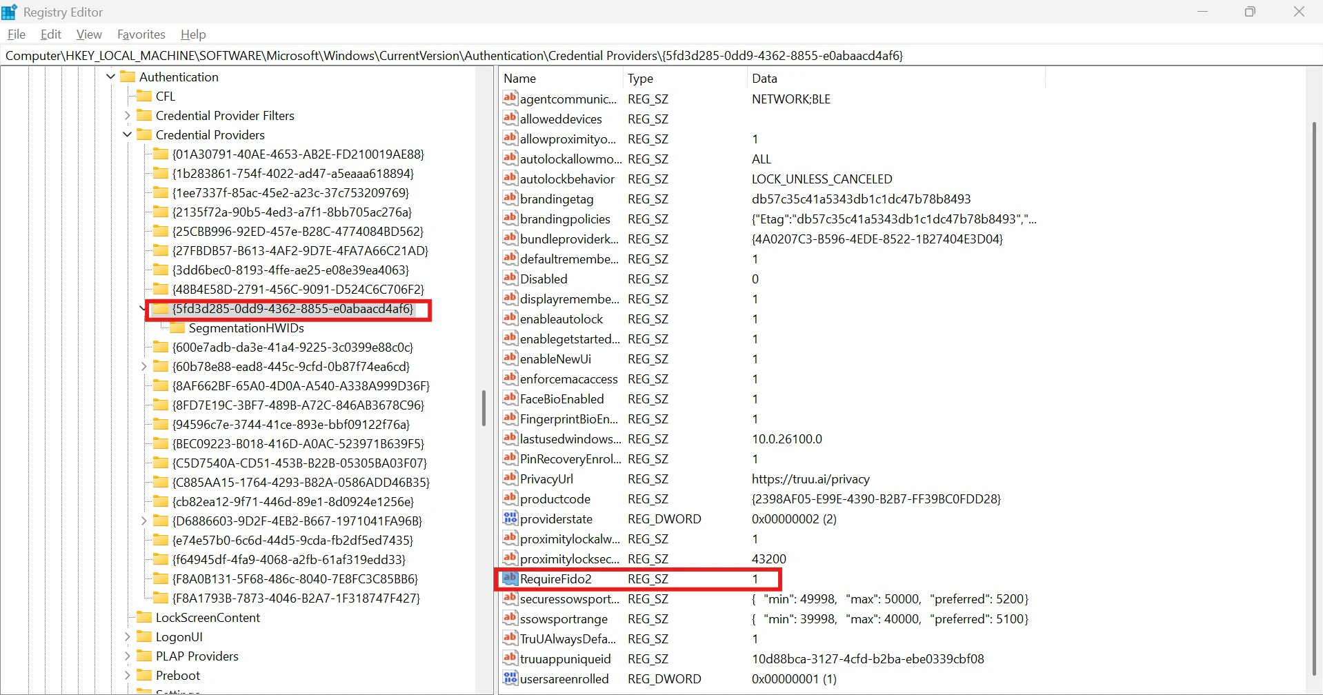 - Select the TruU Credential Provider key. • If the RequiredFido2 value is set to 1, the user is logging in using FIDO2. • If the RequiredFido2 value is set to 0, the user is using certificate-based authentication (smart card login).